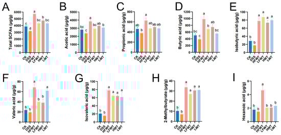 SCFAs, such as acetic, propionic, and butyric acid, comprise over 90% of total SCFAs and are mainly produced by gut microbiota. As shown in Figure 5A–I, DSS treatment markedly reduced SCFA levels compared to the CK group. However, HFWT, LFWT, HWT, and LWT significantly reversed this decline (p < 0.05). HFWT showed the strongest effect, yielding the highest levels of butyric acid, caproic acid, and total SCFAs among all treated groups. These results indicate that both FWT and WT alleviate ulcerative colitis by modulating SCFAs, with HFWT being the most effective.