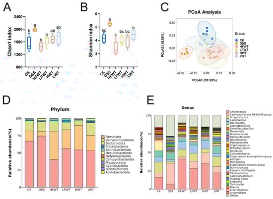 16S rRNA sequencing of colonic feces revealed that DSS administration significantly increased gut microbiota alpha-diversity (Chao1 and Shannon indices), which was subsequently normalized by HFWT, LFWT, HWT, and LWT treatments (Figure 6A,B). PCoA based on Bray–Curtis distance indicated clear separation between the DSS group and other groups, with partial overlap among the CK, LFWT, and LWT groups (Figure 6C), suggesting that both FWT and WT partially restored the DSS-disturbed microbiota structure.