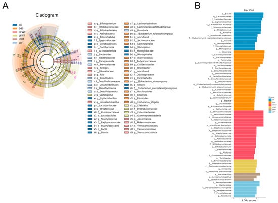 LEfSe analysis (LDA > 3.5) identified key gut microbiota alterations (Figure 7A,B). The DSS group was enriched in taxa, including the Lachnospiraceae NK4A136 group, Desulfovibrio, and multiple lineages within Firmicutes and Desulfobacterota. In contrast, HFWT promoted beneficial probiotics such as Akkermansia and Bifidobacterium. LFWT was characterized by Klebsiella; HWT by Lactobacillus and Limosilactobacillus; and LWT by Bacteroides, Paraprevotella, and Roseburia. These results indicate that FWT and WT intervention was associated with modulation of the gut microbiota in DSS-induced mice, with HFWT showing the most pronounced increase in probiotics like Akkermansia and Lactobacillus.