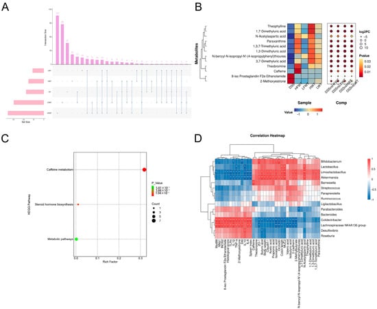 Volcano plots (Figure S3C) revealed 90 differential metabolites between the CK and DSS groups (40 up, 50 down; |log2FC| > 1, VIP > 1, p < 0.05). Relative to the DSS group, the HFWT, LFWT, HWT, and LWT groups exhibited 177 (133 up, 44 down), 148 (130 up, 18 down), 75 (45 up, 30 down), and 55 (41 up, 14 down) differentially abundant metabolites, respectively. Upset plot analysis identified 12 common differential metabolites across all treatment groups compared to DSS (Figure 8A), visualized in a heatmap/bubble plot (Figure 8B). Among these, 8-iso Prostaglandin F2α Ethanolamide and 2-Methoxyestrone were downregulated in all treatment groups. In contrast, caffeine, theobromine, paraxanthine, and 1,3,7-trimethyluric acid were highest in HFWT, while theophylline and three dimethyluric acids were highest in HWT. KEGG enrichment analysis indicated these metabolites were significantly associated with caffeine metabolism and steroid hormone biosynthesis (Figure 8C).