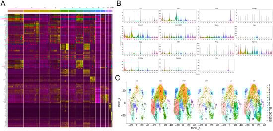 FWT intervention significantly reshaped the cellular landscape in colitis mice, revealing distinct cell clustering and classification patterns. (A) Heatmap displaying the non-redundant top 10 marker genes per cell cluster. Columns correspond to individual clusters (separated by gaps), and rows represent cluster-specific markers, with expression levels color-coded from yellow (high) to purple (low). (B) Violin plots illustrating the expression distribution of key marker genes across identified clusters. (C) t-SNE visualization based on unsupervised random forest classification, depicting the distribution of filtered cells from each experimental group (CK, DSS, HFWT, LFWT, HWT, LWT).