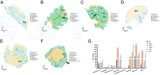 Cell population dynamics analysis revealed that compared to the normal control group (CK), the DSS model group exhibited a significant increase (p < 0.05) in the number of enteric nervous, enterocytes, fibroblasts, goblet cells, and stem cells. Conversely, the number of absorptive cells was reduced. This pattern reflects an imbalance between compensatory repair mechanisms and ongoing tissue injury. In the LFWT, HWT, and LWT groups, the numbers of enterocytes, goblet cells, and stem cells were significantly lower (p < 0.05) than those in the DSS group. However, the fibroblast population showed a significant increase (p < 0.05). This suggests that these treatments may promote fibroblast-mediated microenvironmental remodeling to support epithelial repair (Figure 10G).