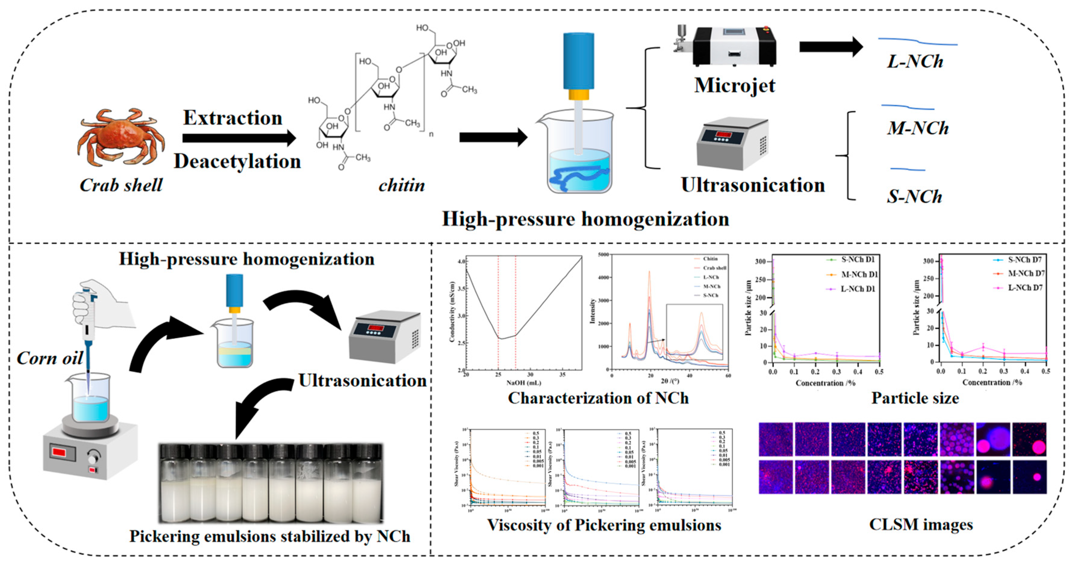 - Lv, J.; Zhang, Y.; Jin, Y.; Oh, D.-H.; Fu, X. Chitin nanofibers prepared by enzymatic hydrolysis: Characterization and application for Pickering emulsions. Int. J. Biol. Macromol. 2024, 254, 127662. [Google Scholar] [CrossRef]