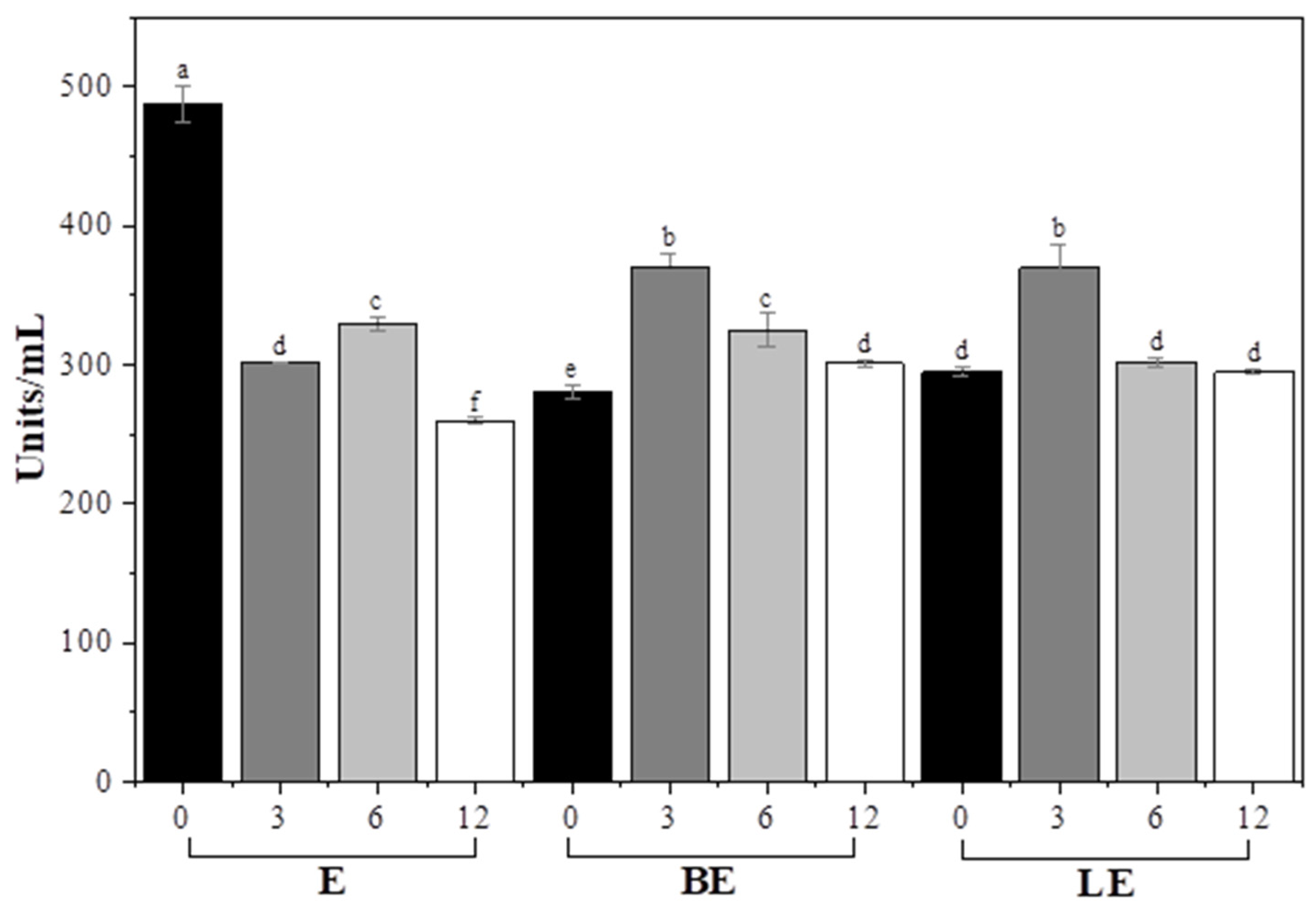 | BE | 3 | 280.47 ± 2.79 aA | 0.21 ± 0.04 aB | 11.60 ± 0.46 bC |