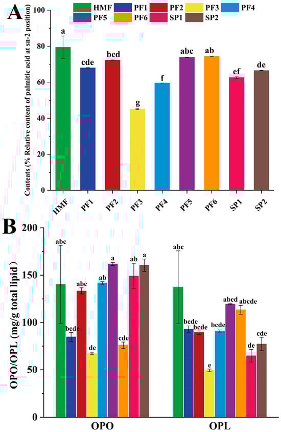 Relative content of palmitic acid at the sn-2 position (A), comparison of OPO and OPL contents (B) in human milk fat (HMF), six formulated lipids (PF 1-6), and two commercial products (SP 1-2). In a bar chart, different lowercase letters represent significant differences (p < 0.05).