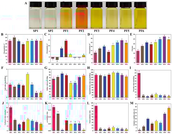 Comparison of physicochemical indexes for PF and SP: Physical display diagram (A), chromaticity L* (B), chromaticity a* (C), chromaticity b* (D), chroma (E), acid value (F), iodine value (G), saponification value (H), peroxide value (I), carbonyl value (J), p-anisidine (K), total oxidation value (L), oxidation induction period (M). In a bar chart, different lowercase letters represent significant differences (p < 0.05).