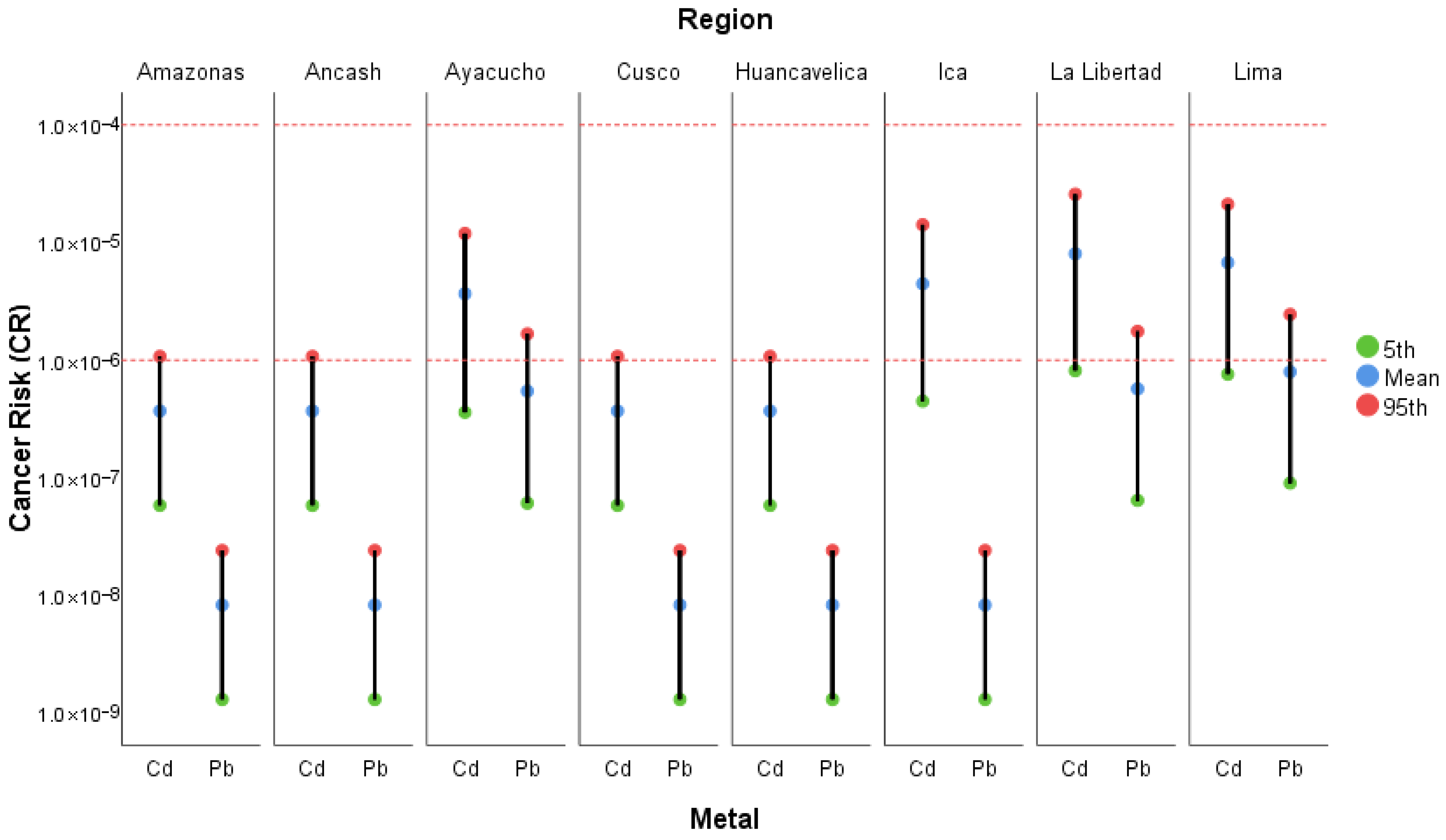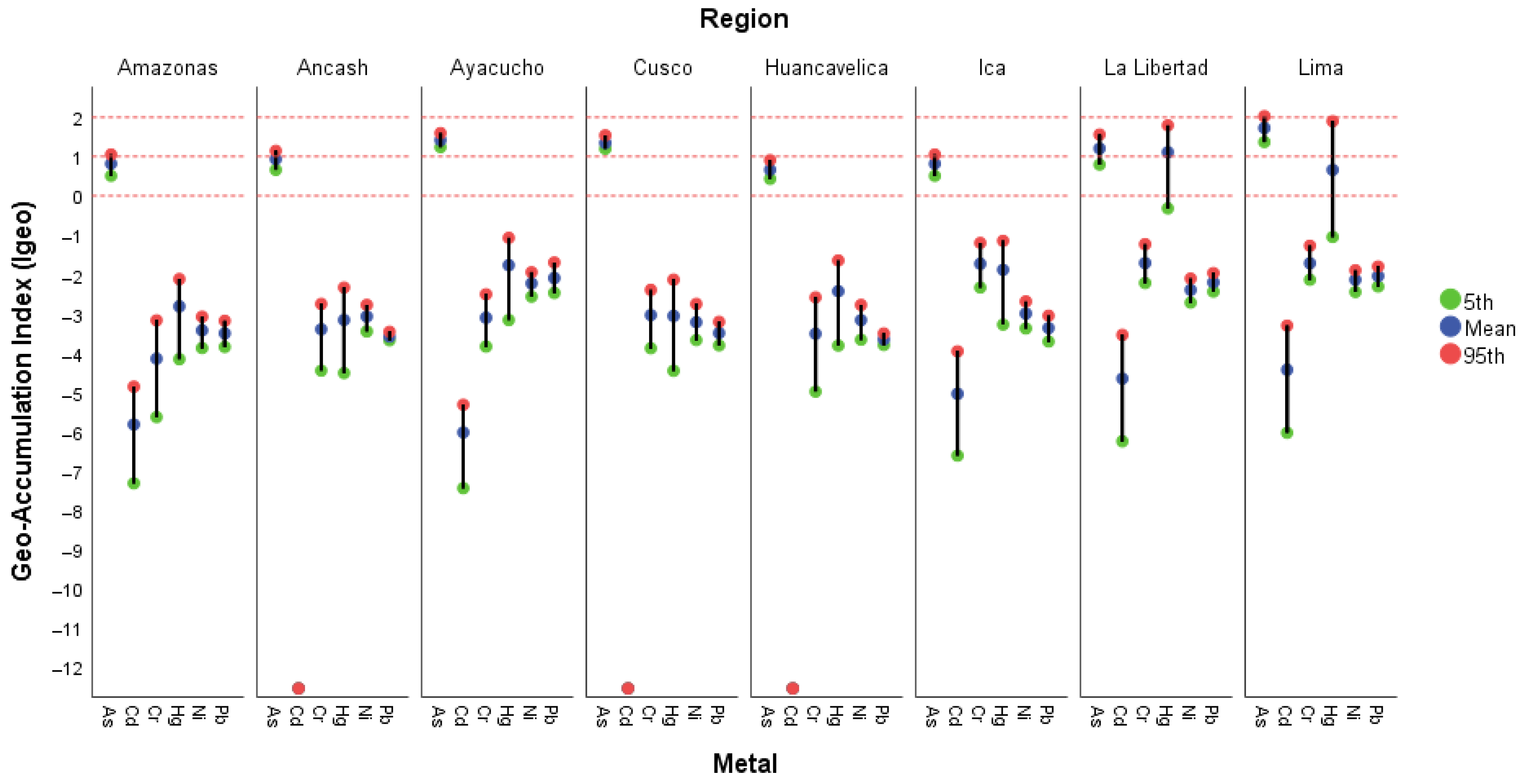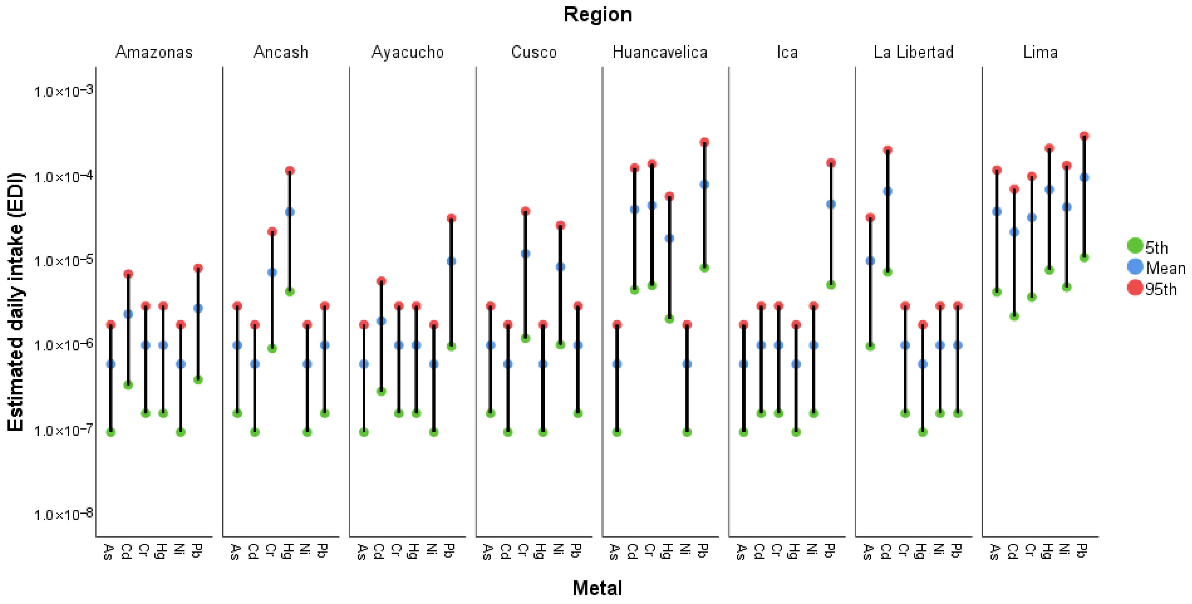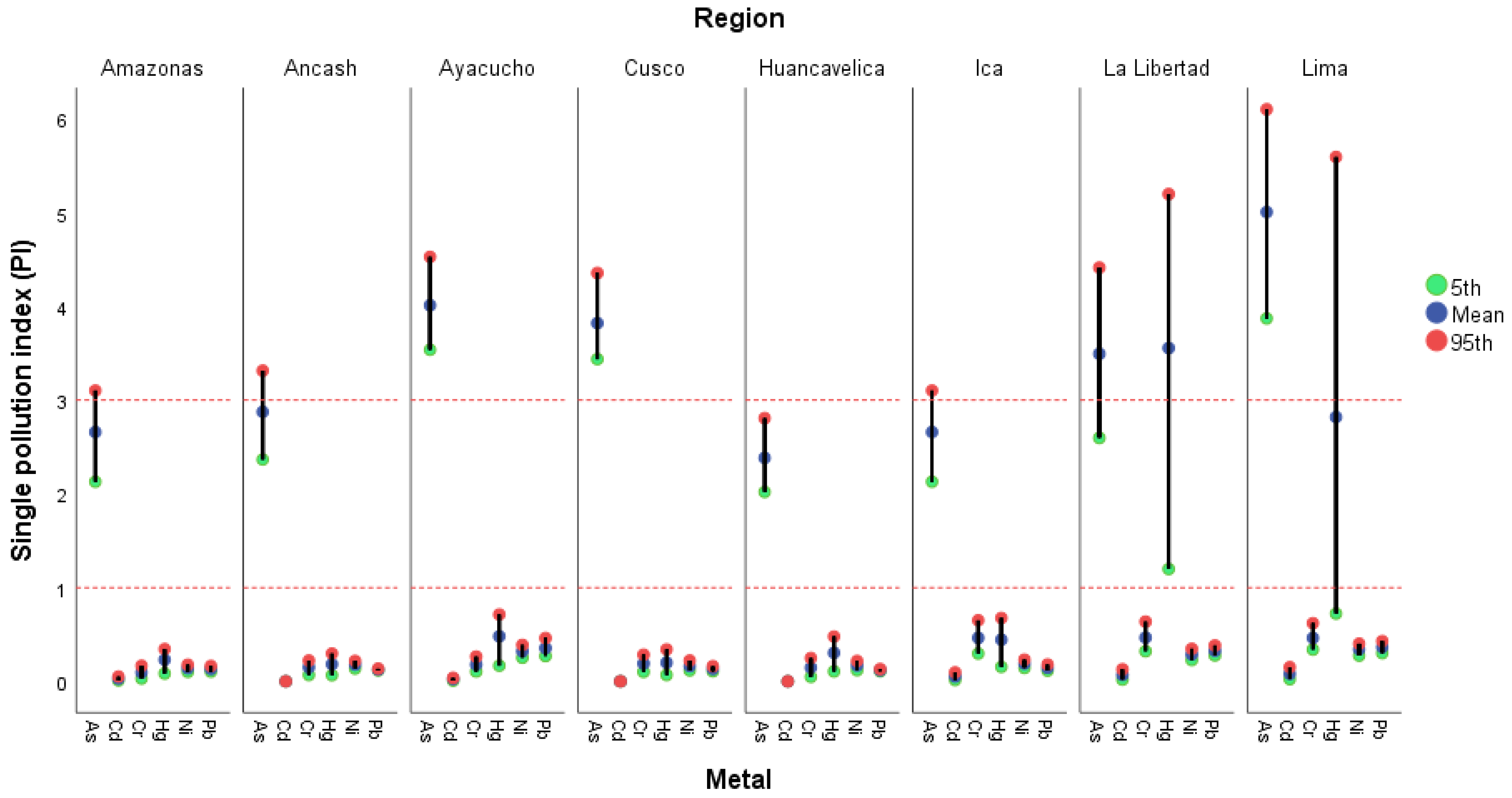| Huancavelica | Mean–S.D. | 34.014 ± 6.504 a | <LOD | 12.635 ± 13.425 a | 0.088 ± 0.064 a | 5.261 ± 2.516 a | 8.064 ± 1.974 c |