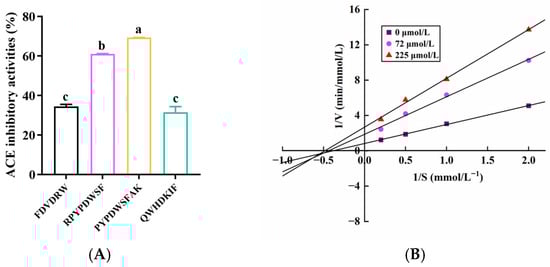 ACE-inhibitory activity and kinetic characterization of the selected peptides. (A) ACE-inhibitory activity of the four peptides exhibiting the lowest binding affinities in molecular docking, each tested at 0.5 mg/mL. Superscript letters on the bars indicate significant differences between groups (p < 0.05). (B) Lineweaver–Burk plot illustrating the inhibition kinetics of PYPDWSFAK against ACE for the determination of the inhibition mode and kinetic parameters.