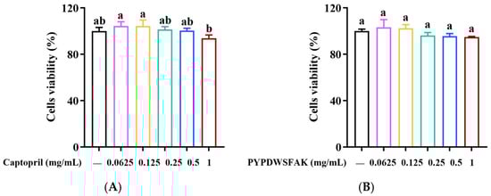 Effects of PYPDWSFAK (A) and captopril (B) on the viability of EA.hy926 cells. Different lowercase letters above the bars indicate significant differences within the same treatment group (p < 0.05).
