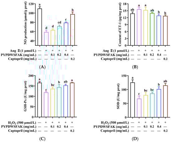 Effects of PYPDWSFAK on NO (A) and ET-1 (B) levels in Ang II-induced EA.hy926 cells, and on GSH-Px (C) and SOD (D) activities in H2O2-damaged EA.hy926 cells. Different lowercase letters indicate significant differences between groups (p < 0.05).