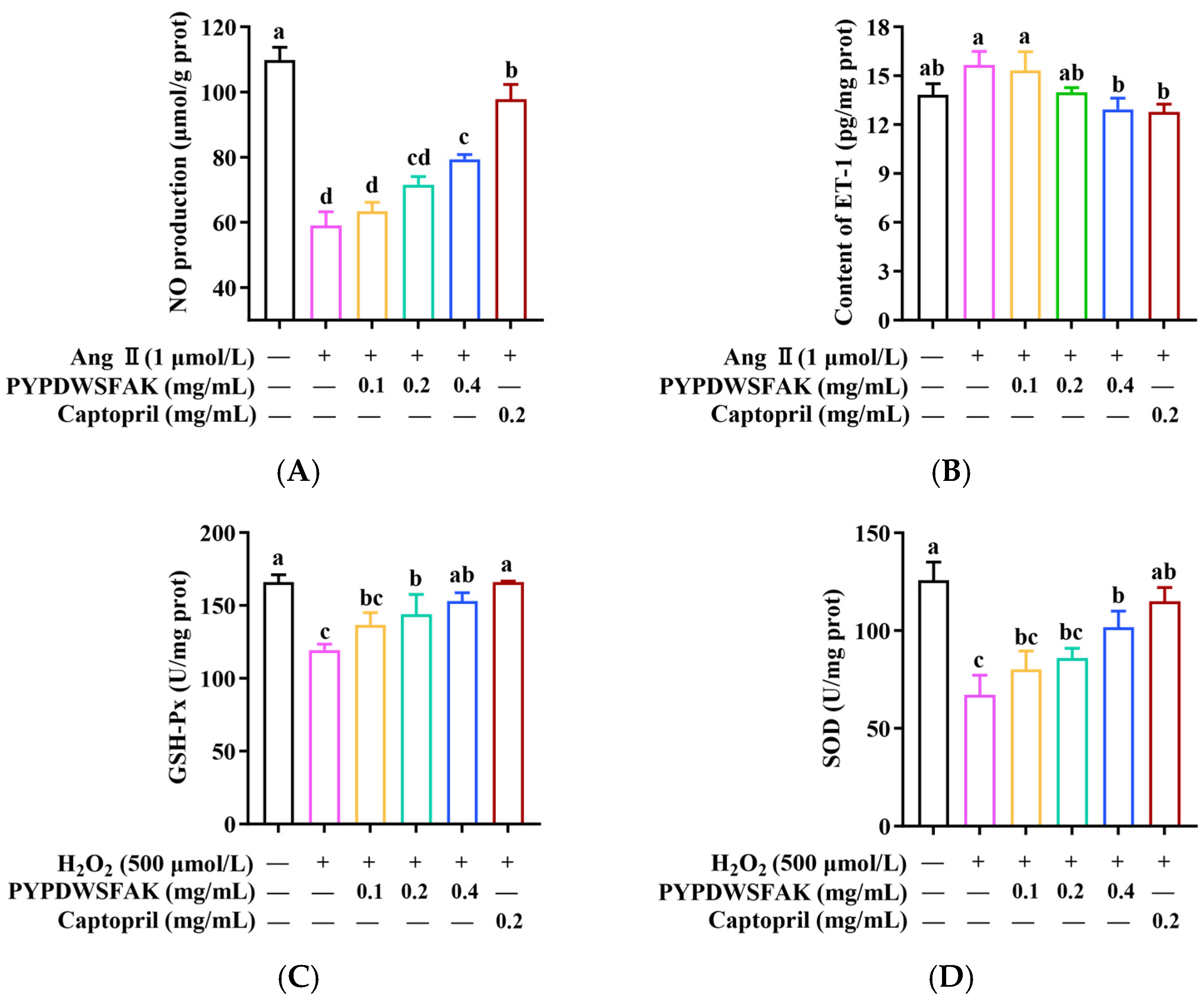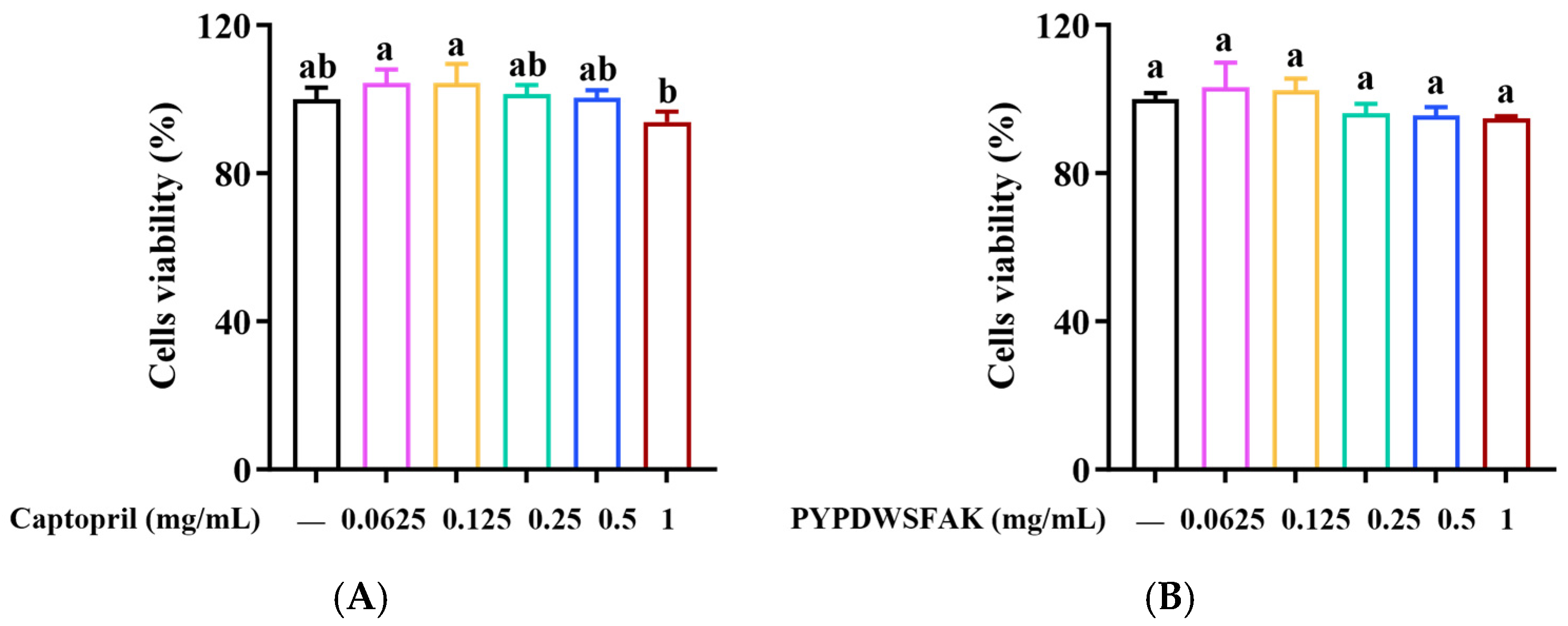 3.9. Effect of PYPDWSFAK on GSH-Px and SOD Activities in H2O2-Damaged EA.hy926 Cells