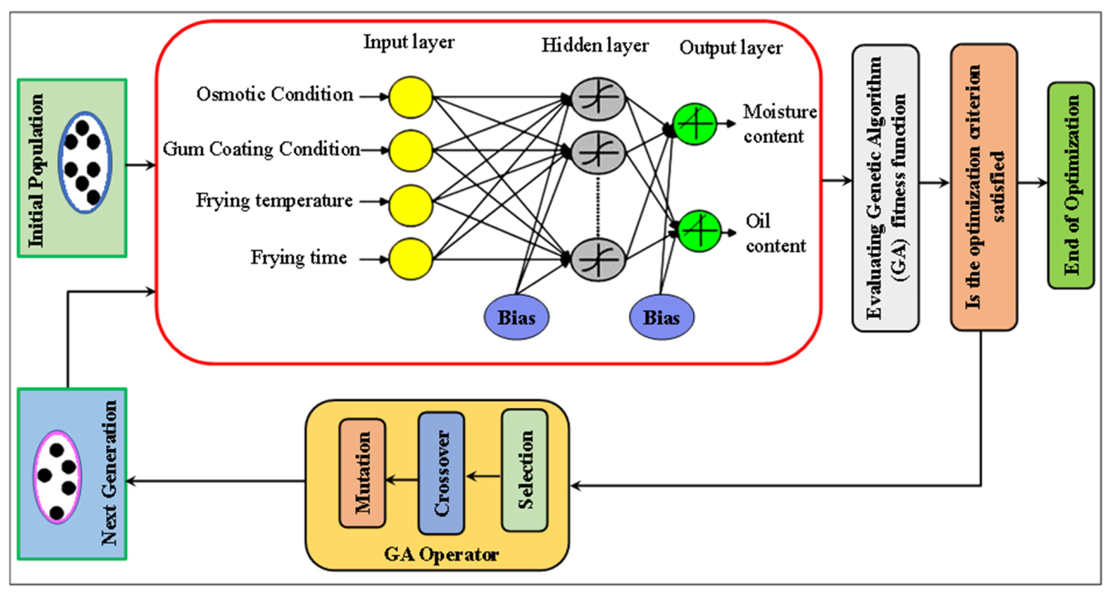 - Mohebbi, M.; Fathi, M.; Shahidi, F. Genetic algorithm–artificial neural network modeling of moisture and oil content of pretreated fried mushroom. Food Bioprocess Technol. 2011, 4, 603–609. [Google Scholar] [CrossRef]