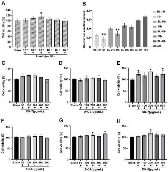 Furthermore, to identify the optimal concentration range of the bioactive peptides, we established a series of concentration gradients (50, 100, 200, 400, and 800 μg/mL) and assessed their effects on HepG2 cell viability. As illustrated in Figure 1C–H, cell viability remained above 95% within the concentration range of 100 to 400 μg/mL, indicating that these concentrations were non-toxic to HepG2 cells. Notably, at certain concentrations within this safe range (e.g., for GR-7, SK-6, and DK-8), cell viability was even significantly higher than the blank group (p < 0.05), suggesting a potential proliferative effect. Based on the non-toxicity observed across 100–400 μg/mL and the potential bioactivity indicated by the increased viability for some peptides, the concentrations of 100, 200, and 400 μg/mL were selected for subsequent evaluation of glucose consumption in IR-HepG2 cells.