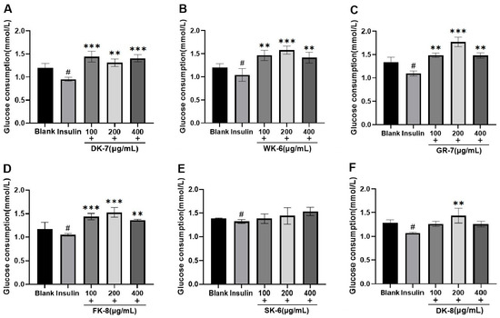 The effects of 6 bioactive peptides from yellow mealworm larvae (Tenebrio molitor) on glucose consumption in the IR-HepG2 cell model. (A) DK-7, (B) WK-6, (C) GR-7, (D) FK-8, (E) SK-6, and (F) DK-8. Symbols indicate statistical significance: # p < 0.05 vs. untreated control group; ** p < 0.01 and *** p < 0.001 vs. insulin-treated group.