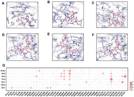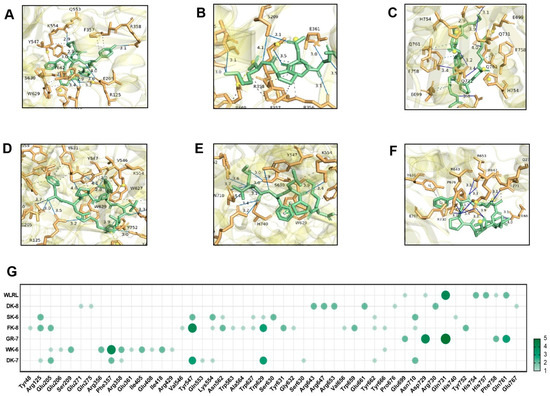 Molecular docking of 6 bioactive peptides with DPP-IV (PDB ID:1WCY). (A–F) 3D diagrams depicting hydrogen bonds and hydrophobic interactions between the peptides and α-glucosidase amino acid residues: (A) DK-7, (B) WK-6, (C) GR-7, (D) FK-8, (E) SK-6, and (F) DK-8. (G) Docking site statistics. Bubble size and color intensity correspond to the number of interacting amino acid residues per peptide.