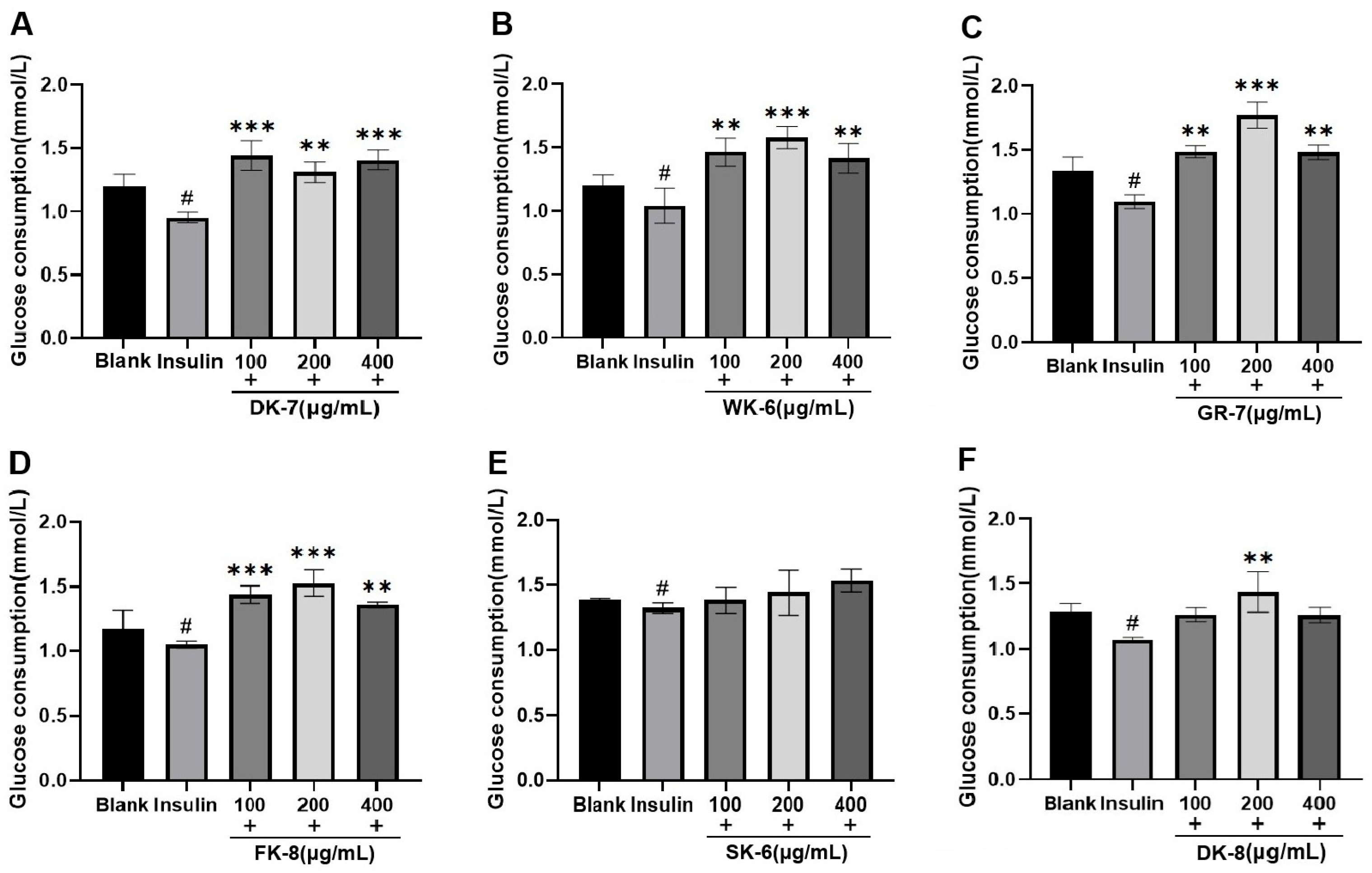 3.3. Effects of Six Bioactive Peptides on Glucose Consumption in IR-HepG2 Cell Model