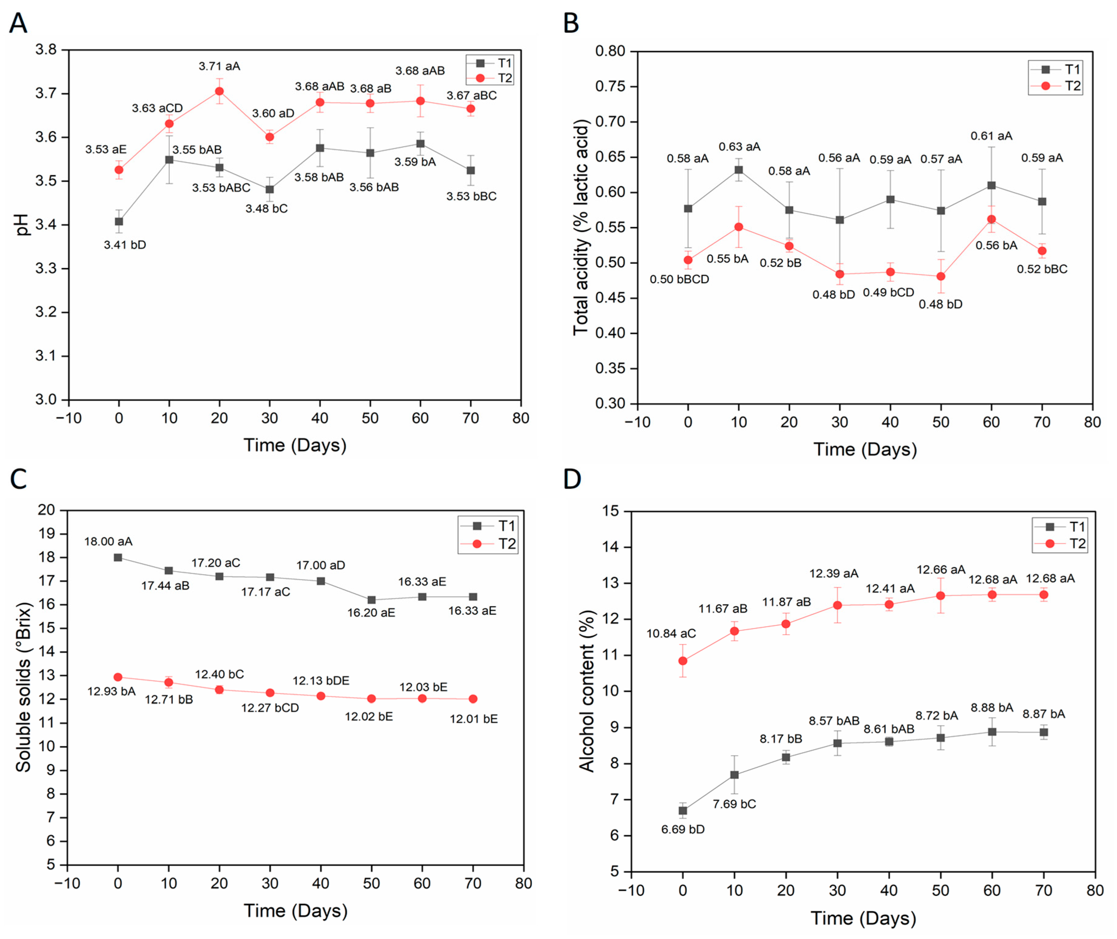 - Nascimento Pereira, K.; de Souza, H.F.; de Oliveira, A.C.D.; Deziderio, M.A.; Di Próspero Gonçalves, V.D.; de Carvalho, M.V.; Kamimura, E.S. Production of “Melomel” from Cupuaçu (Theobroma Grandiflorum) Using the Probiotic Yeast Saccharomyces Cerevisiae Var. Boulardii. Fermentation 2025, 11, 253. [Google Scholar] [CrossRef]