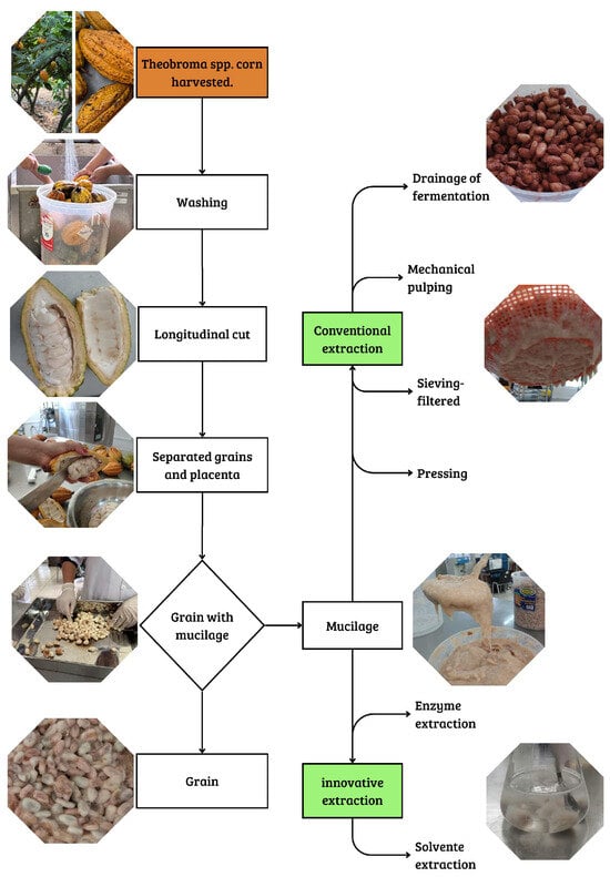 The extraction of Theobroma spp. mucilage can be carried out using traditional methods, based on physical separation as natural drainage during fermentation [12], mechanical pulping [30,31], sieving–filtering [32,33,34] and pressing [35]. However, innovative methods have been proposed, including extraction using organic solvents such as water, ethanol, and methanol, as well as pectolytic enzyme-assisted extraction through liquefaction processes, applied to the mucilage of Theobroma spp. after the pulping stage, with the aim of facilitating the breakdown of the polysaccharide matrix and improving the efficiency of exudate recovery [30,36]. Figure 2 illustrates the conditioning process of Theobroma spp. mucilage-coated grains, as well as the separation methods employed.