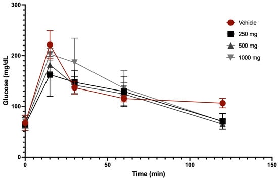 A glucose tolerance curve was obtained after the oral administration of 250 mg/kg, 500 mg/kg, and 1000 mg/kg of extract and vehicle in fasting animals. Figure 3 shows the concentration-dependent glucose tolerance curve after oral administration of Scenedesmus sp. methanol extract. The highest glucose values for the vehicle and extract treatments were observed at 15 min, where respective average values for vehicle, 250 mg/kg, 500 mg/kg, and 1000 mg/kg were 221.5 mg/dL, 159 mg/dL, 182 mg/dL, and 203 mg/dL. After 120 min, all groups returned to baseline glucose levels, except for the vehicle group, whose final glucose level of 106.5 mg/dL was higher than the initial value of 67.5 mg/dL (Figure 3).