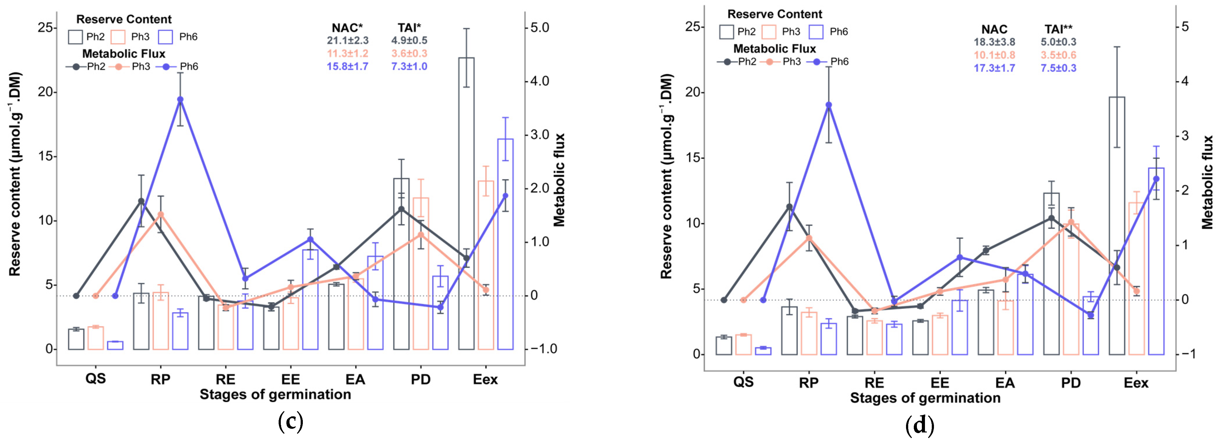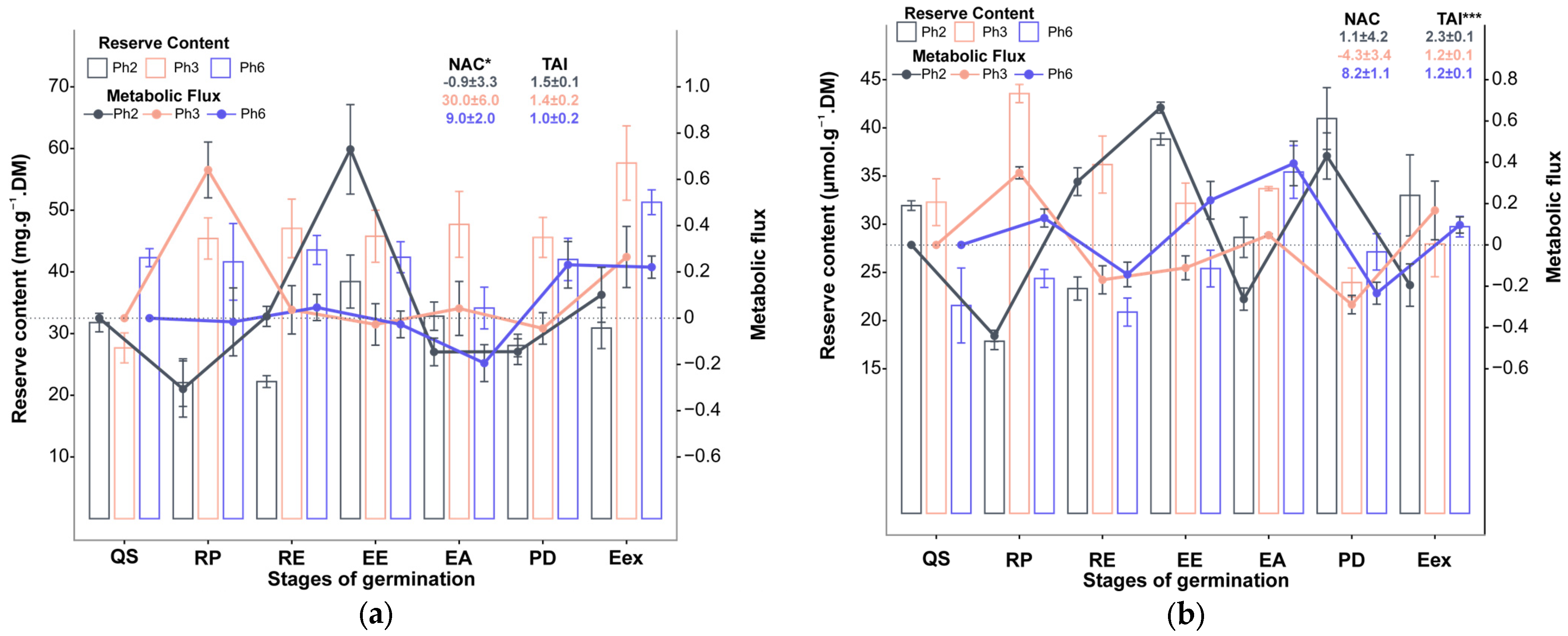 - Silva, A.T.; Ligterink, W.; Hilhorst, H.W.M. Metabolite Profiling and Associated Gene Expression Reveal Two Metabolic Shifts during the Seed-to-Seedling Transition in Arabidopsis Thaliana. Plant Mol. Biol. 2017, 95, 481–496. [Google Scholar] [CrossRef]