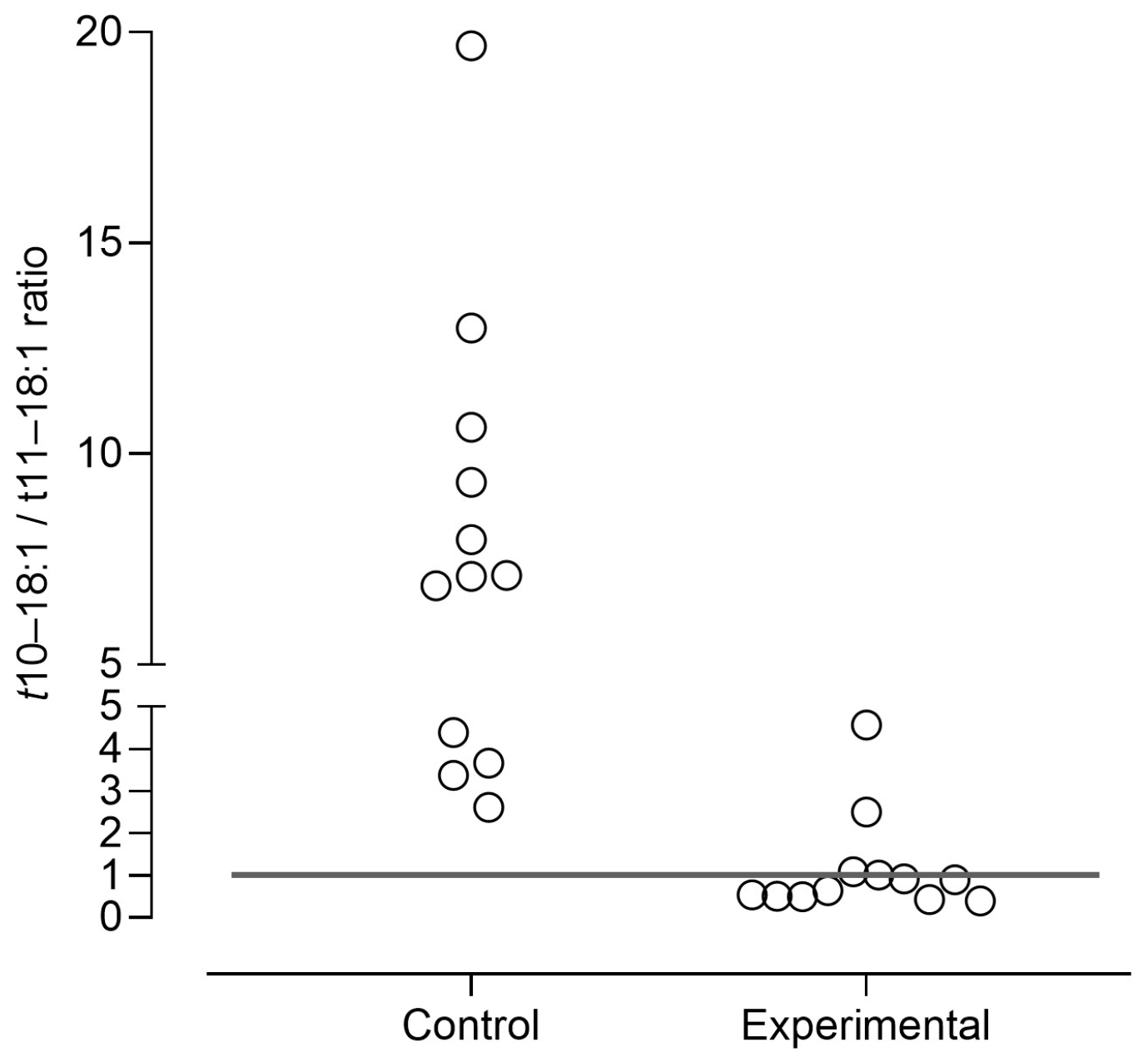 | t10–18:1/t11–18:1ratio | 7.98 | 1.17 | 1.078 | 0.011 |