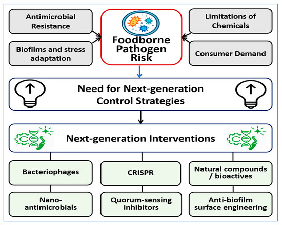 Conceptual overview of the main drivers contributing to foodborne pathogen risk and the rationale for next-generation control strategies. Antimicrobial resistance, biofilm formation and stress adaptation, consumer demand for minimally processed foods, and limitations of conventional chemical controls collectively drive the need for alternative approaches. The figure highlights major categories of emerging interventions examined in this review, including bacteriophages, nano-antimicrobials, quorum-sensing inhibitors, CRISPR-based tools, natural bioactive compounds, and anti-biofilm surface engineering.