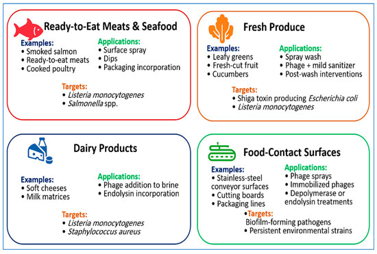 Applications of bacteriophages across food matrices and processing environments. Representative food categories include ready-to-eat meats and seafood, fresh produce, dairy products, and food-contact surfaces. The figure summarizes common application formats, such as surface sprays, dips, wash treatments, packaging incorporation, and immobilized formulations, together with the primary foodborne pathogens targeted in each context. These examples illustrate the practical versatility of bacteriophages and phage-derived enzymes for reducing contamination and supporting food-safety management across different processing settings.