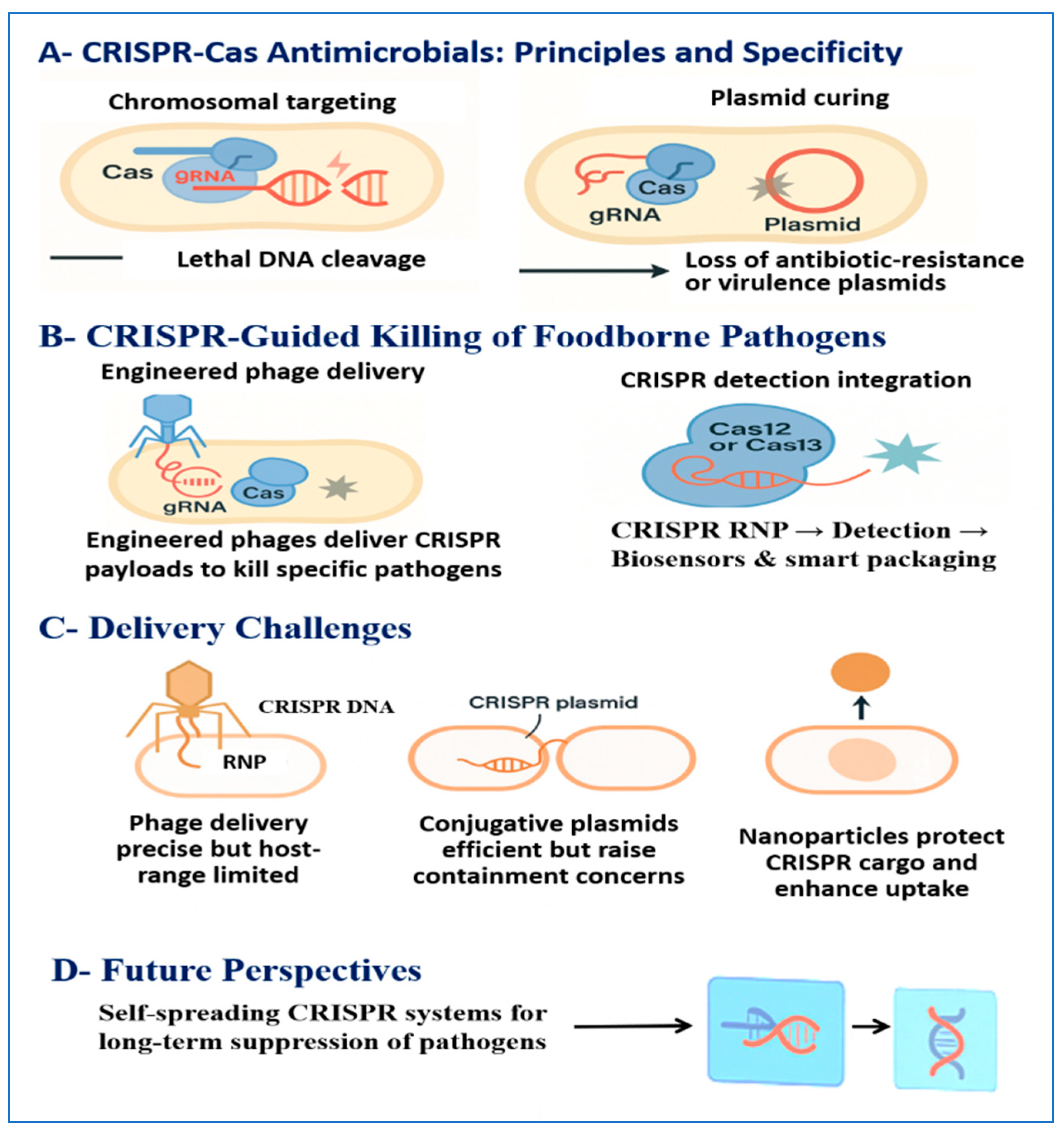 | Future perspectives: self-spreading antimicrobials and programmable sanitation | Replicative CRISPR dissemination and detection-triggered sanitation concepts | CRISPR–transposase and replicating phage systems demonstrate controlled propagation; studies emphasize containment and regulatory oversight | [19,90,190] |