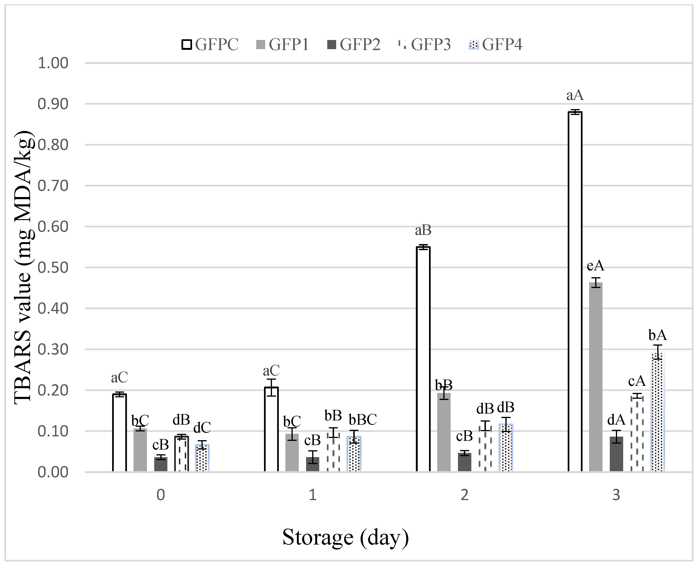 3.3. Lipid Oxidation of Clean Label Ground Fish Patties