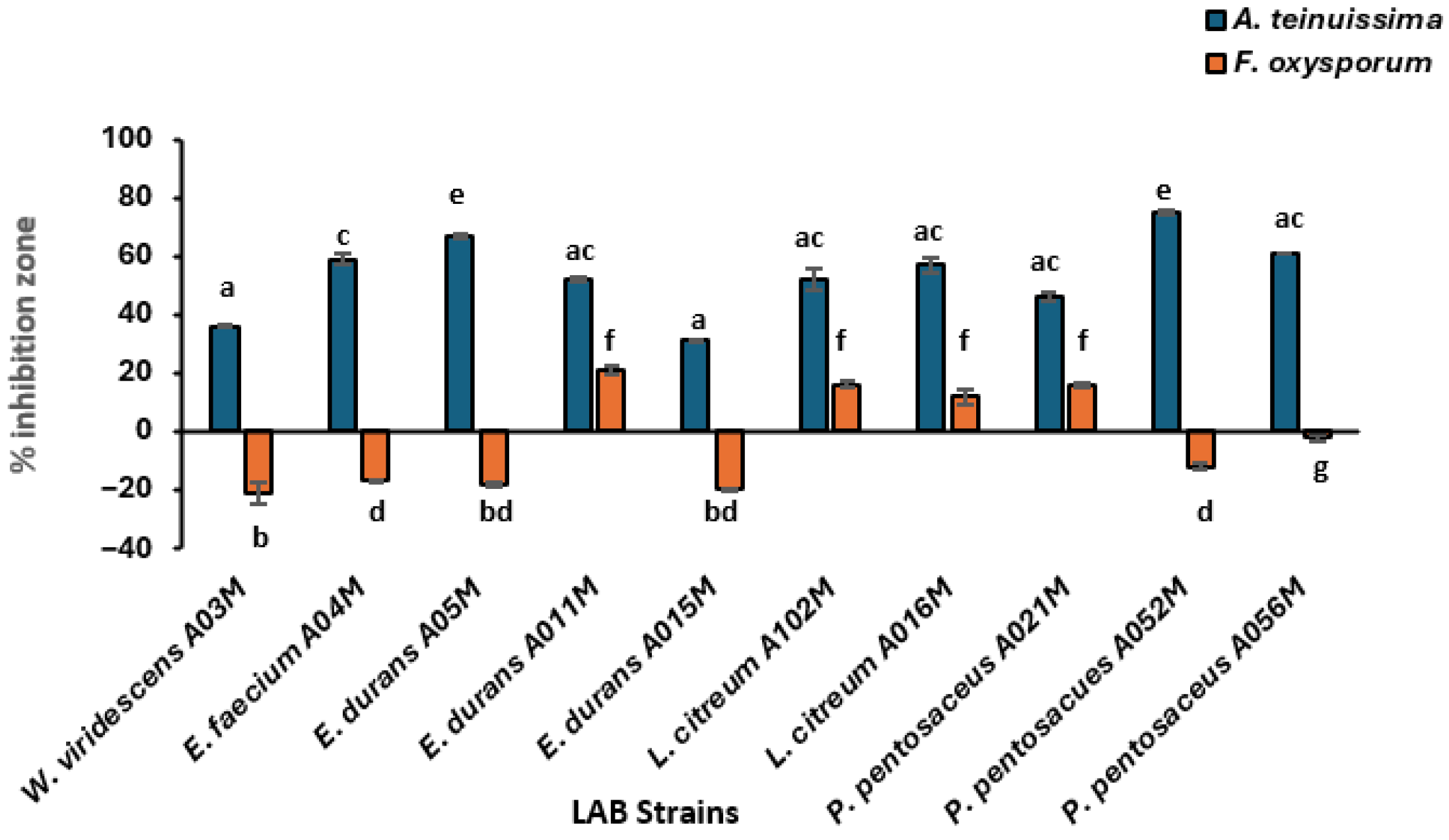 3.3. Antifungal Activity of Viable LAB and Their Cell-Free Supernatants