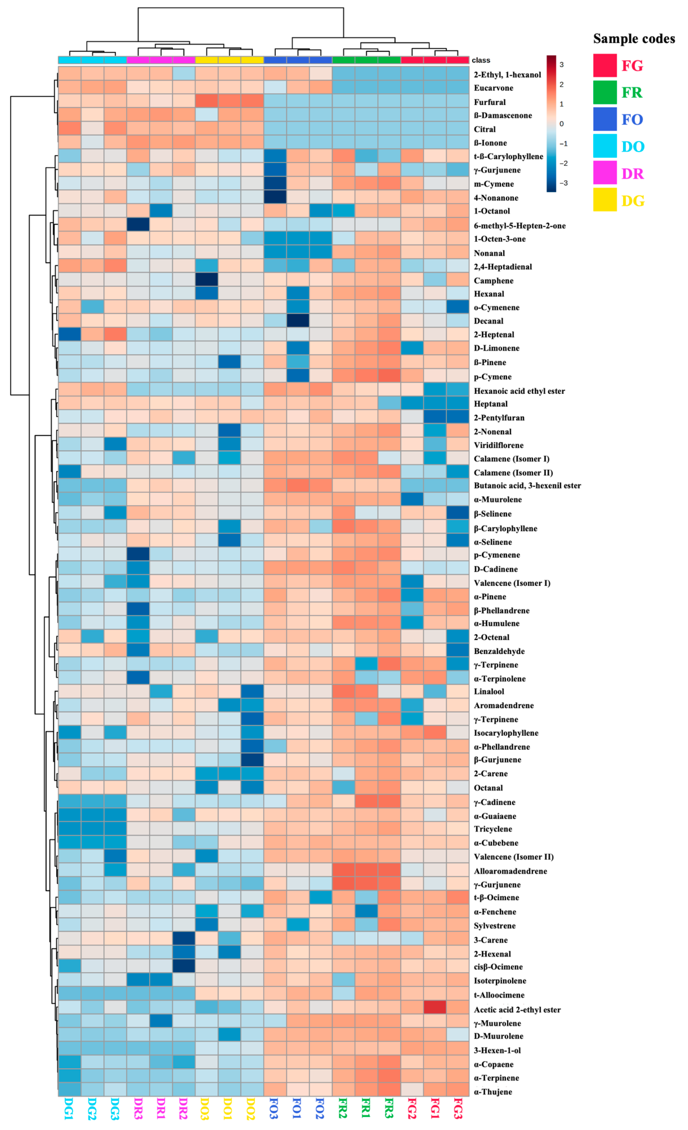 | α-Gurjunene | 0.14 ±0.05 a | 2.35 ± 0.04 d | 1.50 ± 0.06 c | 0.88 ± 0.06 b | 1.56 ± 0.36 c | 0.77 ± 0.09 b |
