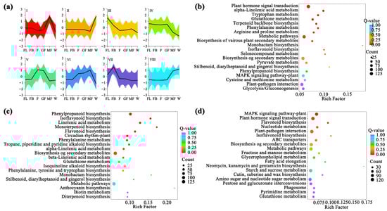 Functional enrichment analysis of flavonoid synthesis DEGs. (a) Expression patterns of the eight clusters correspond to the hierarchical cluster result. Eight main clusters are presented as Cluster I–Cluster VIII. Gene expression values are normalized to log10 (FPKM); (b) TOP20 KEGG functional enrichment analysis of Cluster-IV DEGs; (c) TOP20 KEGG functional enrichment analysis of Cluster-V DEGs; (d) TOP20 KEGG functional enrichment analysis of Cluster-VII DEGs.