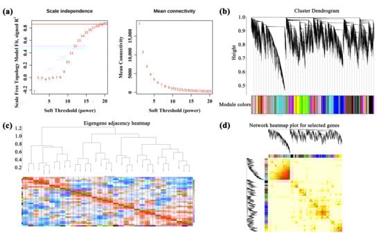 A total of 184,121 genes were identified in A. membranaceus stems and leaves. After removing the genes with low and unstable expression by R language, 36,482 genes were obtained and constructed by weighted gene co-expression network analysis (WGCNA). The square threshold of the correlation coefficient between genes was set to 0.85; that is, R2 > 0.85, the soft threshold (β, power Estimate) was calculated, and β = 19 was selected as the soft threshold (Figure 3a). The clustering tree was constructed according to the correlation of gene expression levels, and the modules were divided by the number of module genes ≥ 50, and the merging threshold of the modules was set to 0.25, resulting in 32 gene modules (Figure 3b). The number of genes in each module was shown in Supplement Table S4. Perform inter module correlation analysis on 32 modules based on their eigengene, and draw a heatmap (Figure 3c). The darker the color of the square (red or blue), the stronger the correlation. Subsequently, the H-clust method was used to cluster the module genes (Figure 3d), where each tree represents a module, and each branch represents a gene, and the darker the color of each point, the stronger the connectivity between the two genes corresponding to the rows and columns.