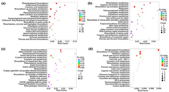 About 50 mg of dried sample powder was added to 1200 μL of pre-cooled 70% methanol aqueous solution for metabolite extraction. The mixture was centrifuged at 12,000 rpm for 3 min, and the supernatant was obtained for UPLC-ESI-MS/MS analysis. Electrospray ionization source was used for mass spectrometry analysis, the temperature was 550 °C, and the ion spray voltage was 5500 V/−4500 V (positive/negative ion mode). Ion source gas I (GS I), gas II (GS II), and curtain gas (CUR) were 50, 60, and 25 psi, respectively, and the scanning mode was MRM. Principal component analysis (PCA) was performed by the statistical function prcomp in R (www.r-project.org). The variable importance in projection (VIP) value was extracted from the orthogonal projections to latent structures–discriminant analysis (OPLS-DA) results, and the score map and permutation map were generated with the R package (version 4.5.1) MetaboAnalystR; the model was the best when p < 0.05. Preliminary screening of differential metabolites was based on OPLS-DA results [30]. The identified metabolites were annotated using the KEGG compound database (http://www.kegg.jp/kegg/compound/, (accessed on 2 November 2025)), and the annotated metabolites were mapped to the KEGG pathway database (http://www.kegg.jp/kegg/pathway.html, (accessed on 2 November 2025)). The metabolites that were significantly regulated were mapped to certain pathways and then subjected to metabolite set enrichment analysis (MSEA). The significance of these pathways was determined using p-values obtained from a hypergeometric test.