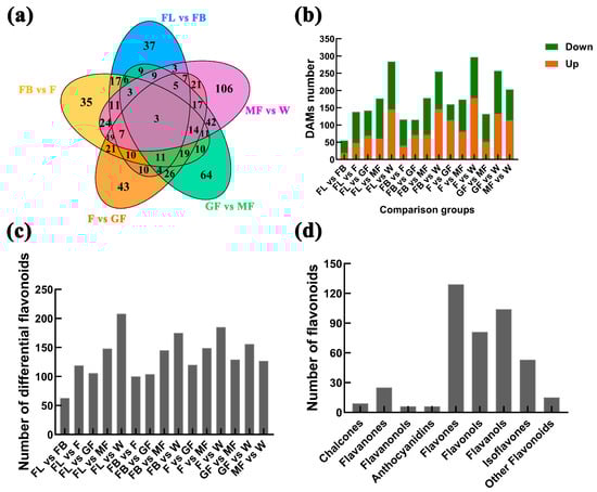 Number of DAMs between different comparison groups. (a) DAMs between comparison groups; (b) up-/down-regulated DAMs, the green box represents down, the orange box represents up; (c) number of differentially accumulated flavonoids; (d) classification of differential accumulation flavonoids.