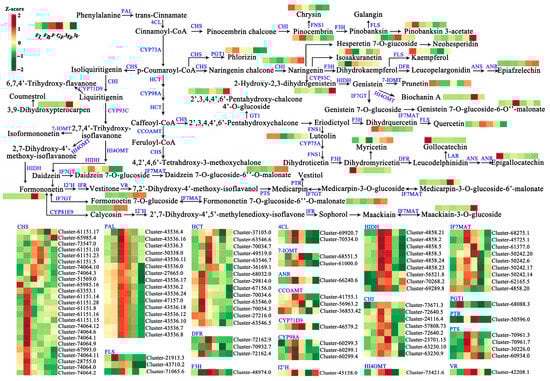 In order to further explore the relationship between DEGs and DEMs involved in flavonoid biosynthesis, this study systematically constructed the flavonoid biosynthesis pathway during the development of A. membranaceus stems and leaves (Figure 7). First, PAL was used as a catalytic enzyme to catalyze the conversion of Phenylalanine to trans-Cinnamate, followed by the conversion to Coumaroyl-CoA under the catalysis of 4CL, and then Coumaroyl-CoA opened two pathways (1–2). (1) Coumaroyl-CoA was converted to Pinocembrin (the largest accumulation in FB stage) under the action of CHS and CHI, and then Pinocembrin opened two pathways (1.1–1.2). (1.1) Pinocembrin was catalyzed by FNS1 to convert into Chrysin (the largest accumulation in FL stage). (1.2) Pinocembrin was catalyzed by F3H to Pinobanksin 3-acetate (the largest accumulation in W stage). (2) Coumaroyl-CoA was converted to p-Coumaroyl-CoA catalyzed by CYP73A, followed by four pathways (2.1–2.4). (2.1) p-Coumaroyl-CoA was converted to Phlorizin (the largest accumulation in FB stage) under the catalysis of CHS and PGT1. (2.2) p-Coumaroyl-CoA was converted to Naringenin (the largest accumulation in W stage) under the action of CHS and CHI, and four pathways were opened at the same time (2.2.1–2.2.4). (2.2.1) Naringenin was successively transformed into Hesperetin 7-O-giucoside (the largest accumulation in GF stage) and Neohesperidin (the largest accumulation in W stage). (2.2.2) Naringenin converted to Isosakuranetin (the largest accumulation in F stage). (2.2.3) Naringenin was transformed into Dihydrokaempferol (the largest accumulation in F stage) under the action of F3H, and two pathways were opened at the same time (2.2.3.1–2.2.3.2). (2.2.3.1) Dihydrokaempferol was converted to Kaempferol (the largest accumulation in FL stage) under the catalysis of FLS. (2.2.3.2) Dihydrokaempferol was converted to Epiafzelechin (the largest accumulation in W stage) under the action of DFR, ANS, and ANR. (2.2.4) Naringenin was converted to 2-Hydroxy-2,3-dihydropistein (the largest accumulation in W stage) under the catalysis of CYP93C, and then converted to Genistein under the catalysis of HIDH, and three pathways were opened (2.2.4.1–2.2.4.3). (2.2.4.1) Genistein was converted to Prunetin (the largest accumulation in FL stage) under the catalysis of 7-IOMT. (2.2.4.2) Genistein was converted to Biochanin A (the largest accumulation in MF stage) under the catalysis of HI4OMT. (2.2.4.3) Genistein was converted to Genistein 7-O-glucoside-6-O’’-malonate (the largest accumulation in F stage) by Genistein 7-O-glucoside catalyzed by IF7GT. (2.3) p-Coumaroyl-CoA was converted to Caffeoyl-CoA under the catalysis of HCT and CYP98A, opening two pathways (2.3.1–2.3.2). (2.3.1) Caffeoyl-CoA was converted to 2′,3,4,4′,6′-Pentahydroxy-chalcone under the catalysis of CHS, and two pathways were simultaneously opened (2.3.1.1–2.3.1.2). (2.3.1.1) 2′,3,4,4′,6′-Pentahydroxy-chalcone was converted to 2′,3,4,4′,6′-Pentahydroxy-chalcone 4′-O-glucoside (the largest accumulation in W stage) under the action of GT1. (2.3.1.2) 2′,3,4,4′,6′-Pentahydroxy-chalcone converted to Eriodictyol, opening two pathways (2.3.1.2.1–2.3.1.2.2). (2.3.1.2.1) Eriodictyol was converted to Dihydrquercetin (the largest accumulation in FL stage) and Quercetin (the largest accumulation in F stage) under the action of F3H and FLS. (2.3.1.2.2) Eriodictyol was converted to Luteolin (the largest accumulation in FB stage) by FNS1, and then converted to Dihydromyricetin (the largest accumulation in FL stage) by CYP75A, FNS1, and F3H, opening two pathways (2.3.1.2.2.1–2.3.1.2.2.2). (2.3.1.2.2.1) Dihydromyricetin converted to Myricetin (the largest accumulation in W stage). (2.3.1.2.2.2) Dihydromyricetin was converted to Leucodelphinidin, opening two pathways (2.3.1.2.2.2.1–2.3.1.2.2.2.2). (2.3.1.2.2.2.1) Leucodelphinidin was converted to Gollocatechin (the largest accumulation in FL stage) under the action of ANR. (2.3.1.2.2.2.2) Leucodelphinidin was converted to Epigallocatechin (the largest accumulation in FL stage) under the action of ANS and ANR. (2.3.2) Caffeoyl-CoA was converted to 4,2′,4,6′-Tetrahdroxy-3-methoxychalone catalyzed by CCOAMT and CHS. (2.4) p-Coumaroyl-CoA was converted to Liquiritigenin under the action of CHS and CHI, opening two pathways (2.4.1–2.4.2). (2.4.1) Liquiritigenin was converted to 6,7,4′-Trihydroxy-flavanone under the action of CYP71D9. (2.4.2) Liquiritigenin was converted to 2,7,4′-Trihydroxy-isoflavanone under the action of CYP93C, and four pathways were opened at the same time (2.4.2.1–2.4.2.4). (2.4.2.1) 2,7,4′-Trihydroxy-isoflavanone converted to 3,9-Dihydroxypterocarpen. (2.4.2.2) 2,7,4′-Trihydroxy-isoflavanone was converted to Isoformononetin (the largest accumulation in MF stage) under the action of 7-IOMT. (2.4.2.3) 2,7,4′-Trihydroxy-isoflavanone was converted to Formononetin (the largest accumulation in MF stage) under the action of HI4OMT and HIDH, opening three pathways (2.4.2.3.1–2.4.2.3.3). (2.4.2.3.1) Formononetin was converted to Medicarpin-3-O-glucoside-6′-malonate (the largest accumulation in MF stage) under the action of I2′H, IFR, VR, PTS, IF7GT, and IF7MAT. (2.4.2.3.2) Formononetin was converted to Formononetin 7-O-glucoside (the largest accumulation in MF stage) under the action of IF7GT, and then converted to Formononetin 7-O-glucoside-6′′ -O-malonate (the largest accumulation in MF stage) under the action of IF7MAT. (2.4.2.3.3) Formononetin was converted to Calycosin (the largest accumulation in MF stage) under the action of CYP81E9, and then finally converted to Maackiain-3-O-glucoside (the largest accumulation in W stage) under the action of I2′H, IFR, and IF7MAT. (2.4.2.4) 2,7,4′-Trihydroxy-isoflavanone was converted to Daidzein under the action of HI4OMT and HIDH, opening two pathways (2.4.2.4.1–2.4.2.4.2). (2.4.2.4.1) Daidzein was converted to Daidzein 7-O-gluco