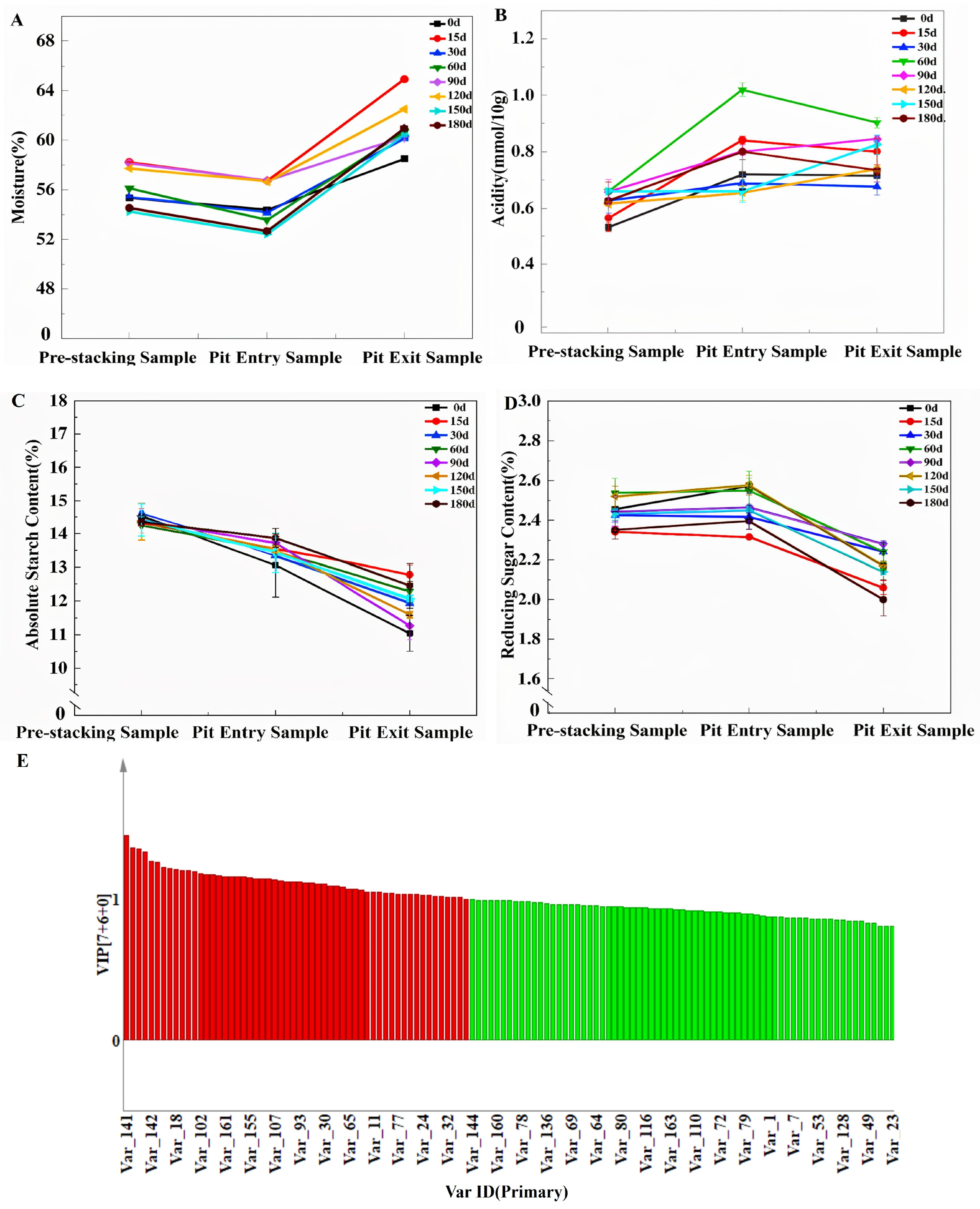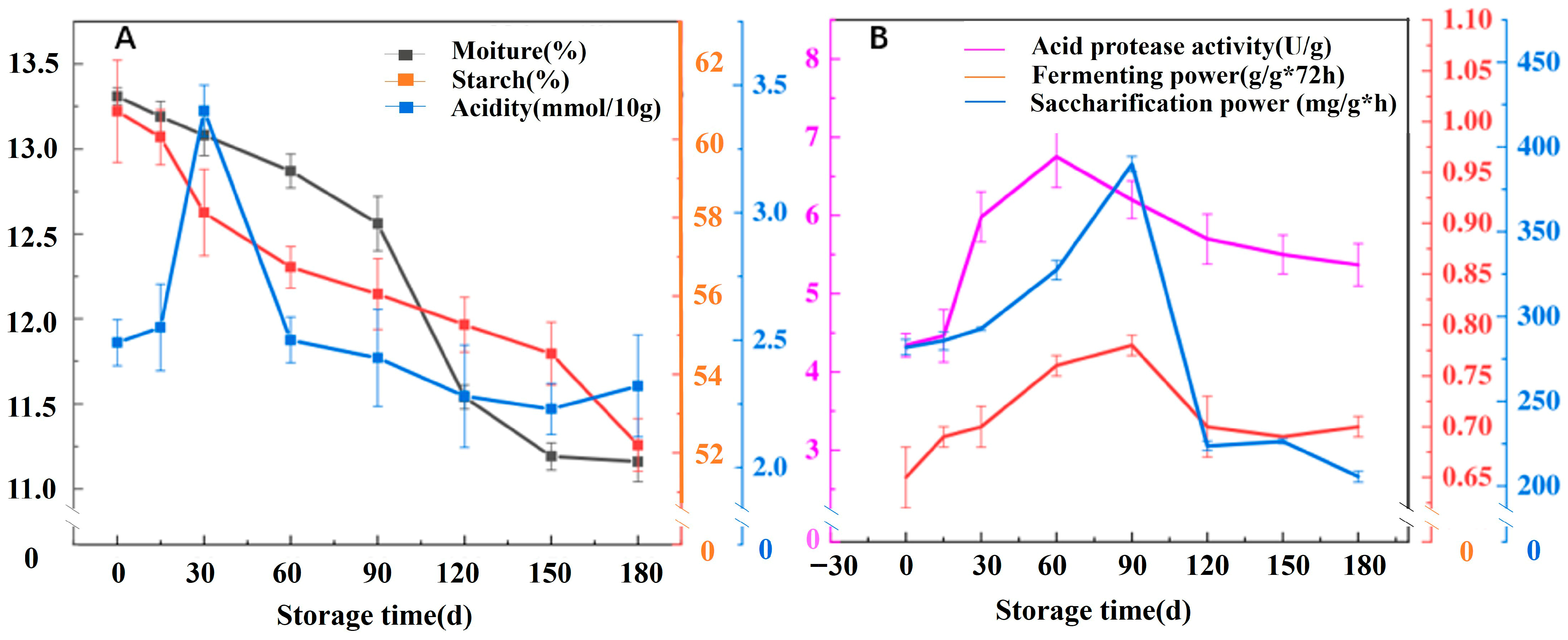 3.1. Physicochemical Differences in Jiang-Flavor Daqu at Different Storage Stages