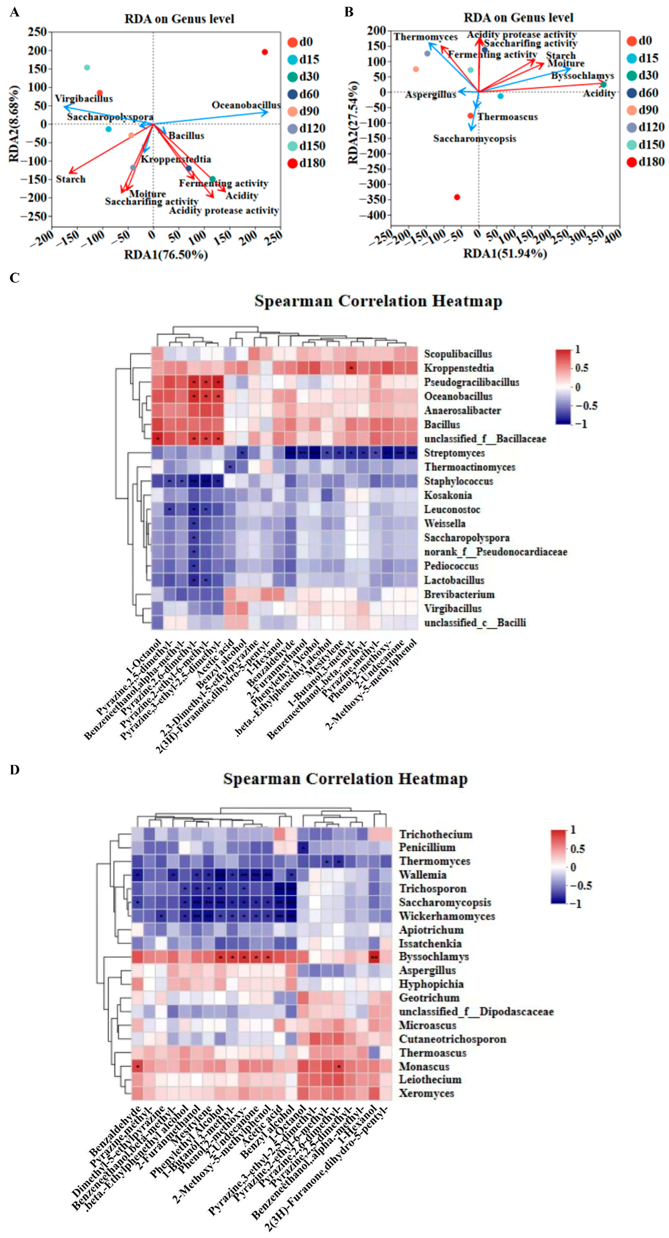 - Luo, Y.C.; Liao, H.; Luo, Y.; Gao, L.; Xia, X.L. Temperature-driven microbial assembly and flavor compound dynamics in high-temperature Daqu: Adaptive co-evolution for efficient Tetramethylpyrazine production. Int. J. Food Microbiol. 2025, 441, 111325. [Google Scholar] [CrossRef] [PubMed]