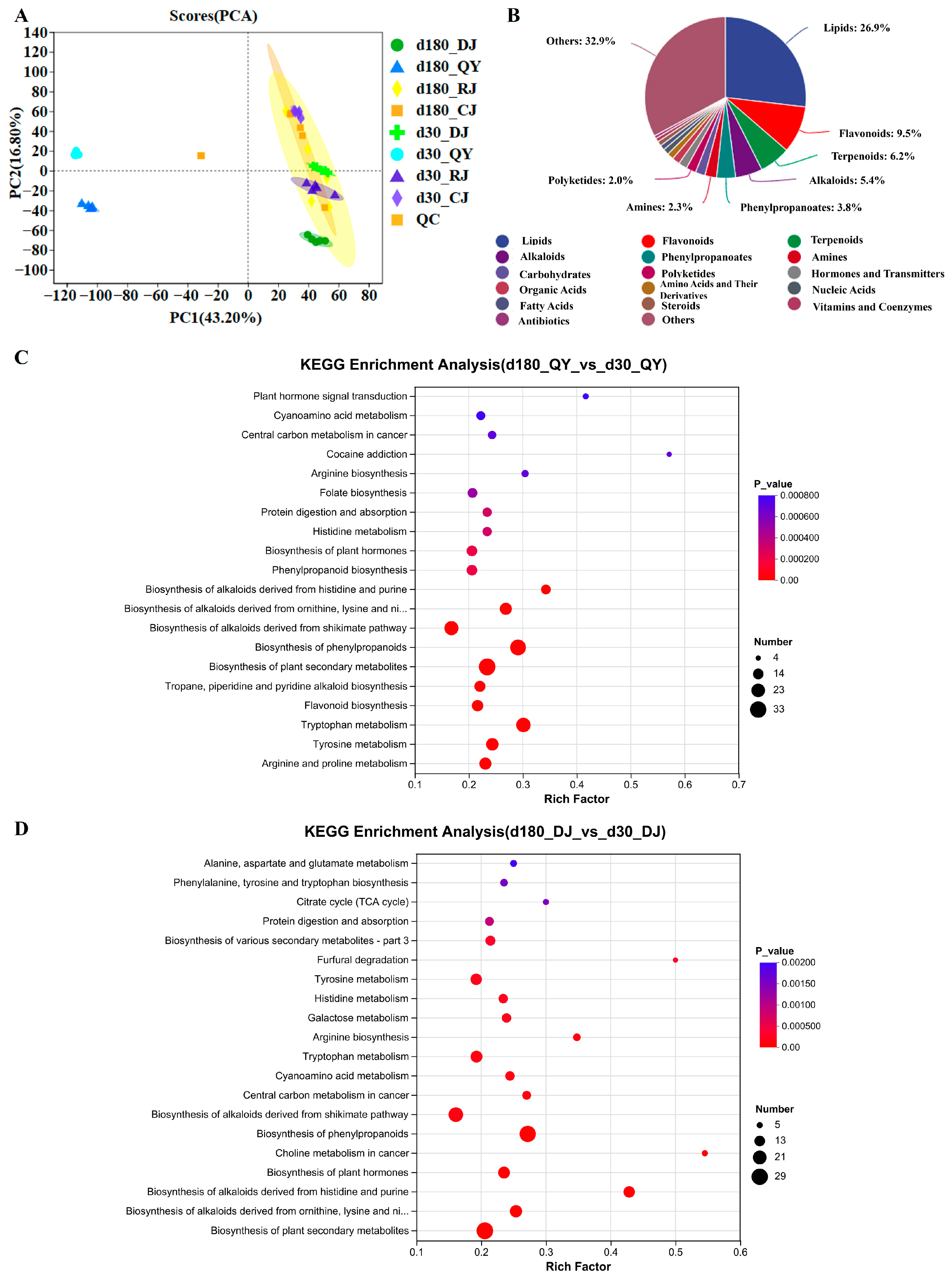 3.6. Untargeted Metabolomics Analysis of Jiang-Flavor Daqu During Storage and Brewing Stages