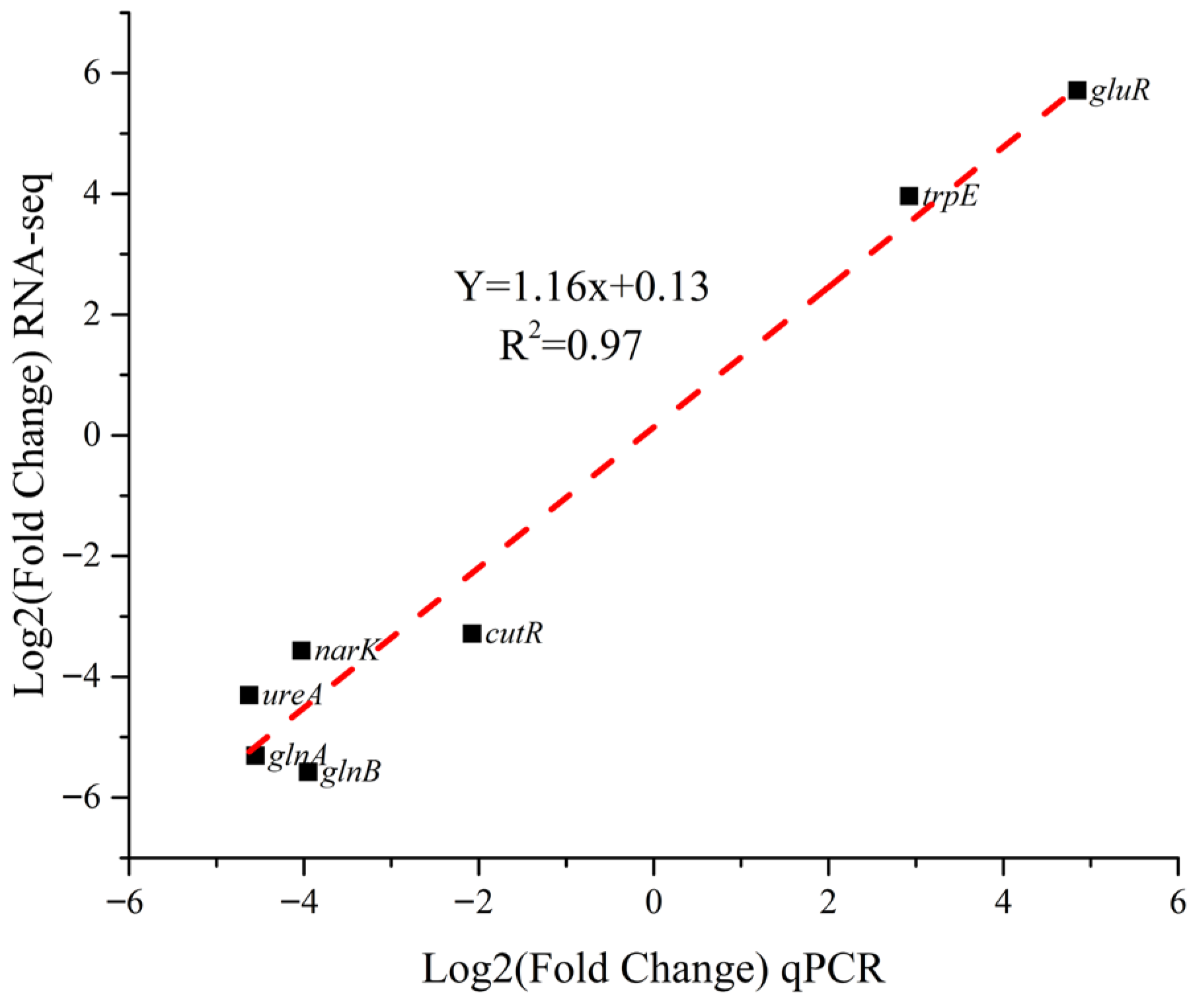 | gene6084 | glnB | −5.58 | 9.27 × 10−4 | Nitrogen regulatory protein |