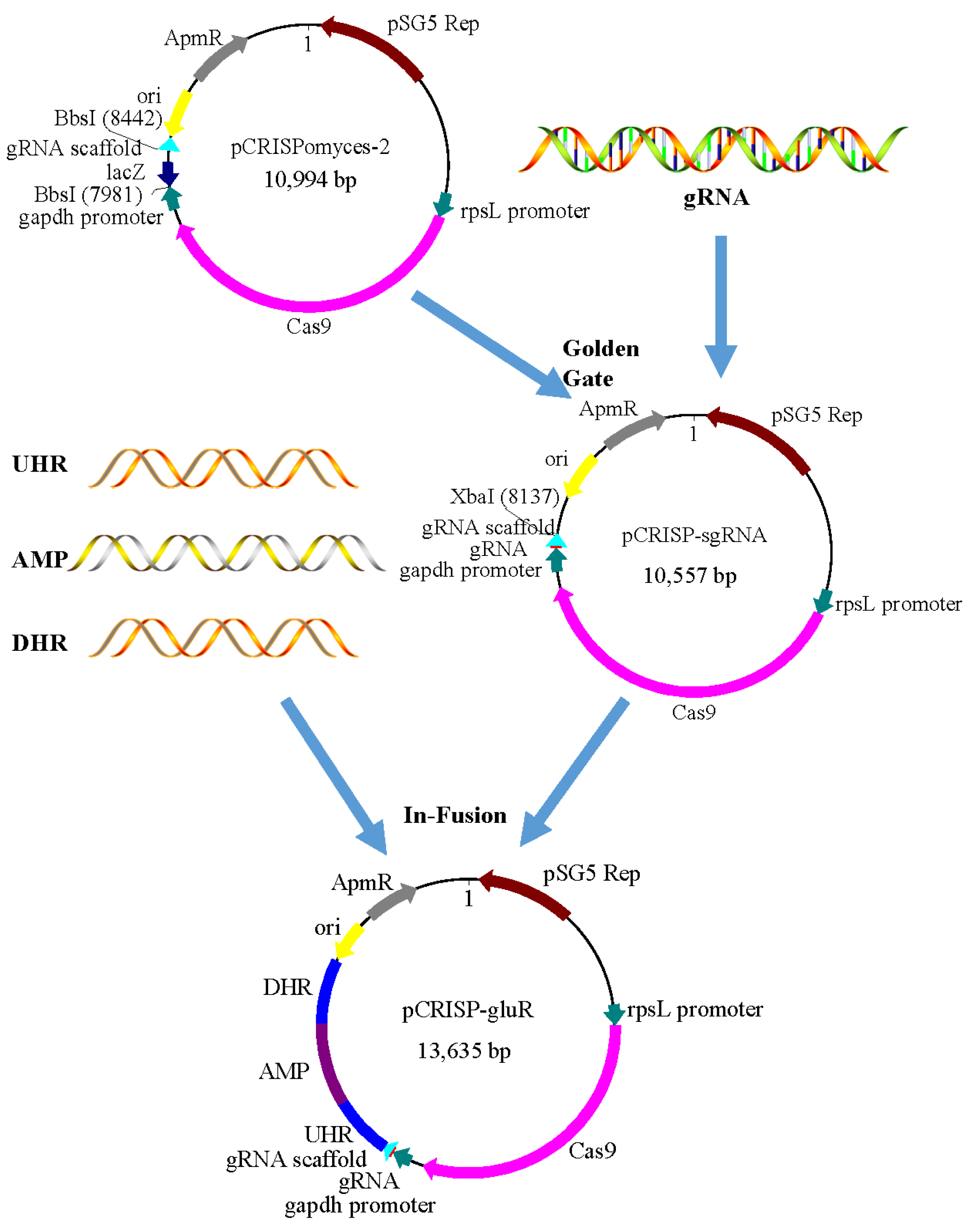 - Zeng, H.; Wen, S.; Xu, W.; He, Z.; Zhai, G.; Liu, Y.; Deng, Z.; Sun, Y. Highly efficient editing of the actinorhodin polyketide chain length factor gene in Streptomyces coelicolor M145 using CRISPR/Cas9-CodA(sm) combined system. Appl. Microbiol. Biotechnol. 2015, 99, 10575–10585. [Google Scholar] [CrossRef] [PubMed]