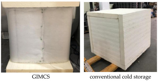 Two cold storage units with identical internal volumes—each measuring 5.26 × 2.63 × 3.73 m (approximately 50 m3)—were constructed for comparative evaluation. One unit employed the gas-inflated membrane cold storage (GIMCS) system, while the other followed a conventional cold storage design. A schematic representation of both systems is shown in Figure 2.