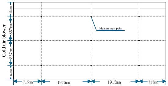 To ensure accurate and standardized evaluation of temperature distribution, temperature measurement points were arranged in accordance with cold storage testing specifications. Monitoring locations were divided into three vertical layers: upper, middle, and lower, positioned at heights of 3.7 m, 2.6 m, and 1.3 m above the floor, respectively. Identical horizontal sensor layouts were maintained at each vertical level to enable spatially consistent temperature comparisons. The planar arrangement of the measurement points is illustrated in Figure 3.