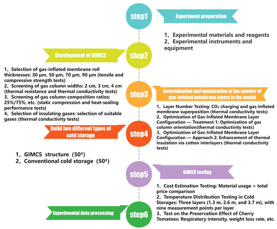 Gas-inflated membrane rolls (standard widths of 90, 100, and 110 cm) were obtained from Cangnan Binqiang Packaging Co., Ltd. (Wenzhou, China). Rigid polyurethane insulation panels (90 cm × 90 cm × 20 cm) used for conventional cold storage were purchased from Shanghai Yejun Refrigeration Equipment Co., Ltd. (Shanghai, China). PVC pipes (3 cm diameter) and corresponding three-way connectors (3.2 cm diameter) were supplied by Tianjin Dongli Xinfangsheng Hardware and Building Materials Branch (Tianjin, China). Multilayer PA/PE composite membranes with nominal thicknesses of 30, 50, 70, and 90 μm were purchased from Tianjin Binhai Building Materials Market (Tianjin, China). A total of 3 kg of Ca-201-PE adhesive was obtained from Dongguan Chuangcheng Adhesive Products Co., Ltd. (Dongguan, China). In addition, 200 polyethylene fresh-keeping bags and 10 kg of cherry tomatoes were purchased from Tianjin Binhai Jinbaorao Wholesale Market (Tianjin, China). Analytical-grade reagents, including carboxymethyl cellulose, galacturonic acid, carbazole, and anhydrous ethanol, were supplied by Tianjin Damo Chemical Reagent Factory (Tianjin, China). A commercial peroxidase (POD) activity assay kit was obtained from Beijing Solarbio Science and Technology Co., Ltd. (Beijing, China).