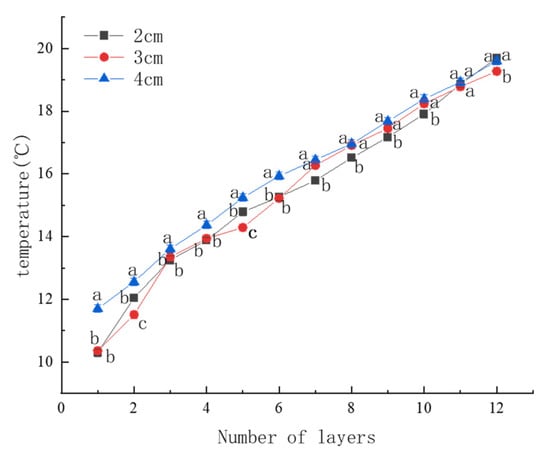 Three gas-inflated membrane cold storage units were placed inside a large environmental chamber maintained at a constant temperature of 0 °C to simulate a stable external environment. A heating cable of identical length (30 cm) was installed at the center of each cold storage to provide a uniform internal heat source. Six multi-point temperature probes were evenly distributed within each storage unit to monitor internal temperature distribution, while an additional probe was placed outside the cold storage units but within the environmental chamber to record ambient temperature. Once the ambient temperature stabilized at 0 °C, internal temperature data were continuously recorded. The experiment was repeated with increasing numbers of gas-inflated membrane layers, enabling systematic comparison of thermal insulation performance under identical boundary conditions.
