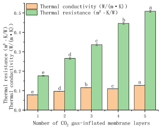 Carbon dioxide (CO2) was introduced into gas-inflated membranes (30 cm × 30 cm, thickness 0.08 mm). The number of membrane layers was increased incrementally, and the corresponding thermal conductivity was measured using a calibrated thermal conductivity tester. The optimal number of layers was determined based on the measured insulation performance.