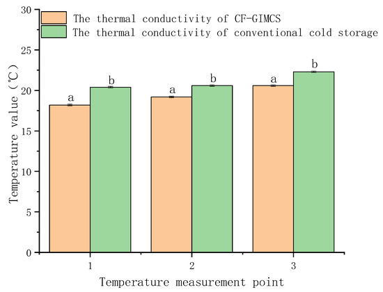 Comparative testing between GIMCS and conventional cold storages of similar volumes (~50 m3) revealed that GIMCS reduced construction costs to 38% of those of conventional systems. Temperature distribution within GIMCS was highly uniform, with a maximum horizontal temperature differential of only 1.4 °C, comparable to conventional systems. No statistically significant differences were observed in core preservation metrics, including weight loss rate and respiration intensity. Notably, GIMCS demonstrated slightly better maintenance of fruit firmness (1.30 kg·cm−2) compared to conventional storage (1.26 kg·cm−2), indicating enhanced quality retention during storage. These results confirm that GIMCS meets the functional requirements for medium- to short-term on-farm cherry tomato storage.