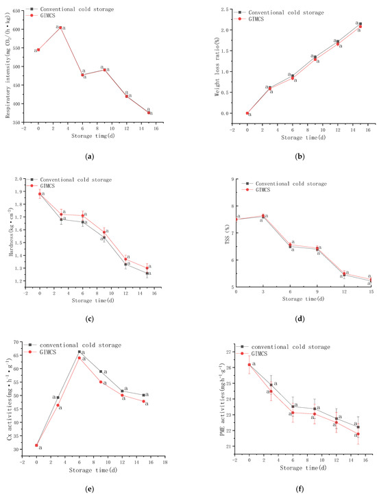 Protopectin retention is directly associated with firmness, whereas soluble pectin accumulation reflects enzymatic degradation of cell walls during ripening. The GIMCS group maintained higher protopectin levels and lower soluble pectin accumulation than the conventional cold storage group, providing mechanistic evidence for delayed softening. Although firmness measurements did not show statistically significant differences, the directional trends in pectin transformation support a biologically meaningful effect. These results indicate that GIMCS effectively modulates key aspects of cell wall metabolism, offering a promising strategy to enhance textural stability and prolong shelf life under cold storage conditions.