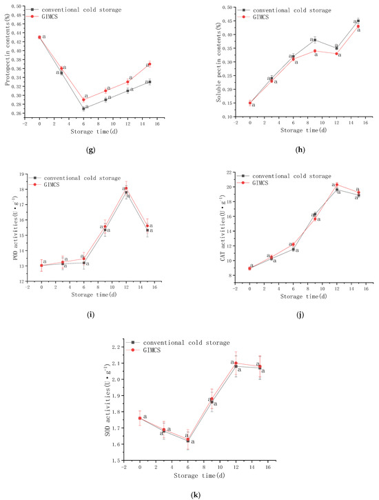 Protopectin is a critical structural component and intercellular adhesive within the plant cell wall, and its enzymatic conversion to soluble pectin drives cell wall disassembly and tissue softening during postharvest ripening [66]. As shown in Figure 17g, protopectin content in cherry tomatoes decreased during the early storage period, reaching a minimum on day 6 in both the GIMCS and conventional cold storage groups, followed by a partial recovery. Notably, the GIMCS-treated fruits consistently retained higher protopectin levels throughout storage, suggesting a potential attenuation of cell wall degradation, although the difference was not statistically significant. Soluble pectin content (Figure 17h) progressively increased in both groups, reflecting ongoing pectinolytic activity. However, the GIMCS group exhibited a more gradual increase in soluble pectin accumulation, indicating a slower rate of protopectin breakdown. While the day 9 difference did not reach statistical significance, the consistent trend across multiple time points underscores its biological relevance. These observations suggest that GIMCS may better preserve cell wall integrity by modulating pectin metabolism, thereby contributing to improved textural stability during storage.