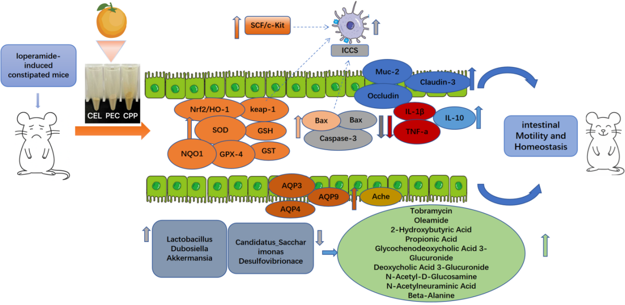 - Deng, M.; Ye, J.; Zhang, R.; Zhang, S.; Dong, L.; Su, D.; Zhang, M.; Huang, F. Shatianyu (Citrus grandis L. Osbeck) whole fruit alleviated loperamide-induced constipation via enhancing gut microbiota-mediated intestinal serotonin secretion and mucosal barrier homeostasis. Food Funct. 2024, 15, 10614–10627. [Google Scholar] [CrossRef]